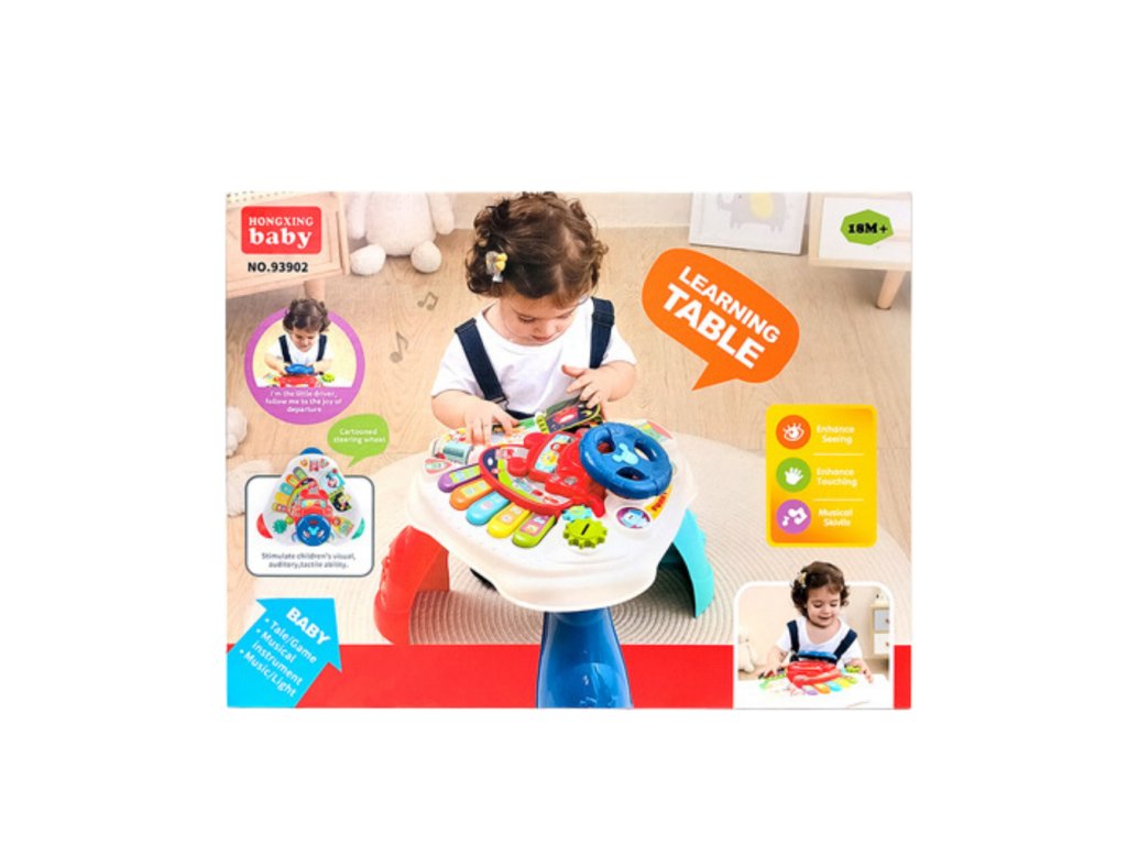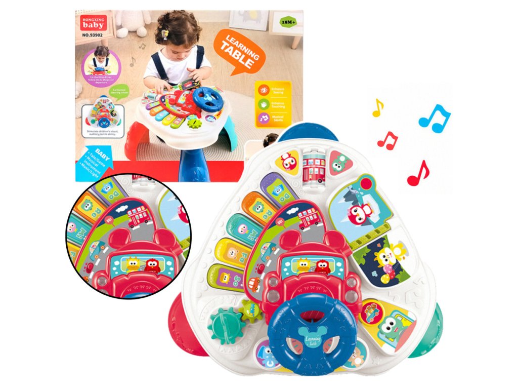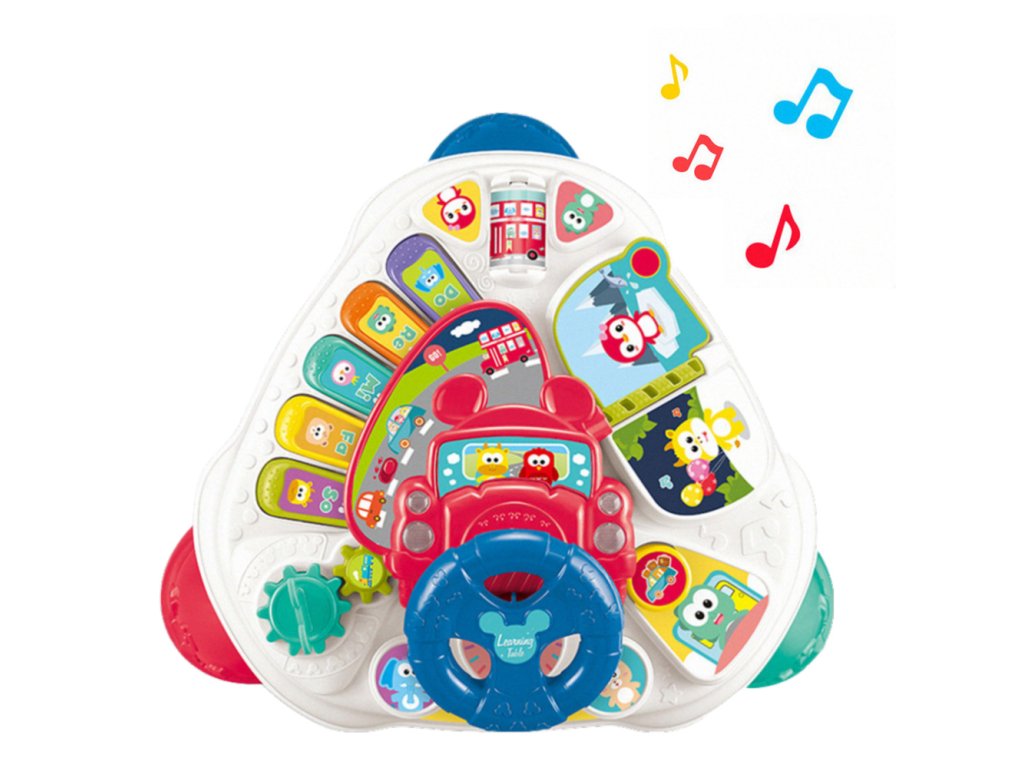 Hračka je vybavena klavírem s barevnými klávesami, které dítěti představí svět prvních melodií a zvuků. Další světelné a zvukové efekty přitahují pozornost batolete a podporují učení hrou. Součástí stolu je také volant s klaksonem, umožňující dítěti vžít se do role řidiče, což navíc rozvíjí jeho motorickou koordinaci a motoriku.