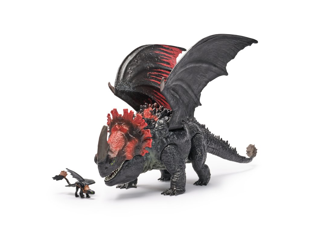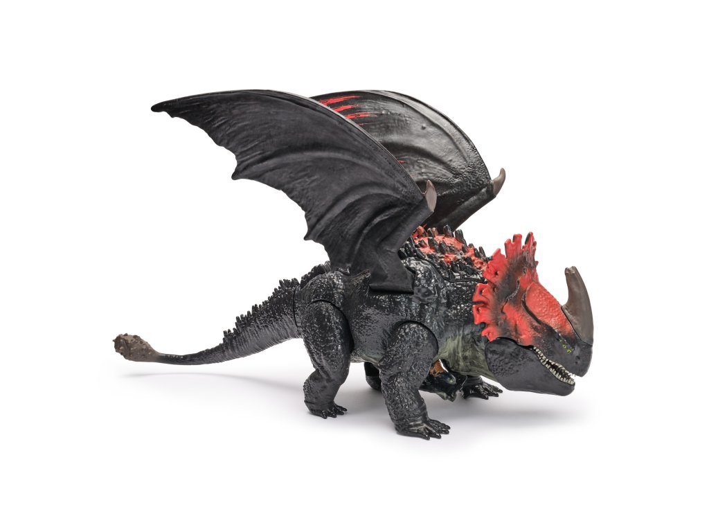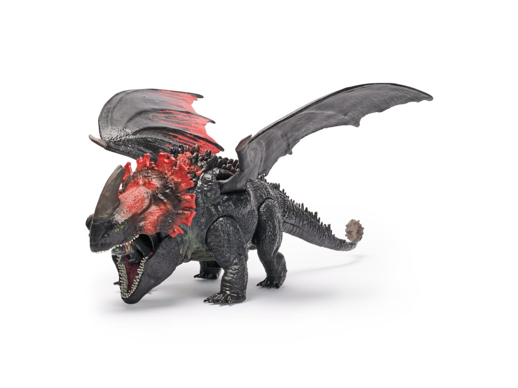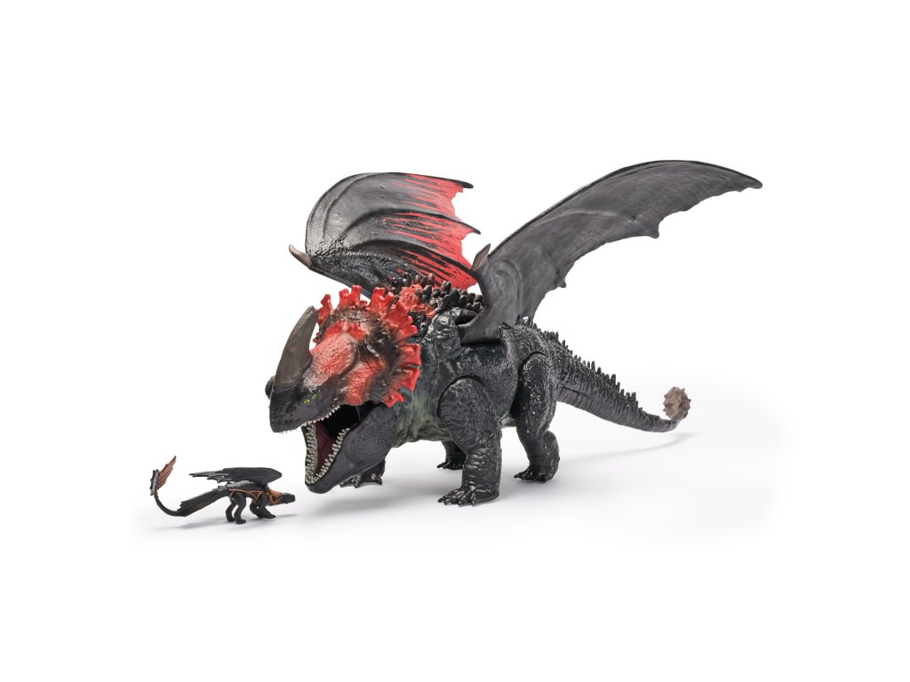 Tato 28cm hračka inspirovaná světem Jak vycvičit draka ožije stisknutím tlačítka, roztáhne zubatá křídla a zuřivě zatne čelisti. Umístěte do něj exkluzivní miniaturu