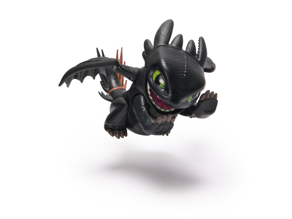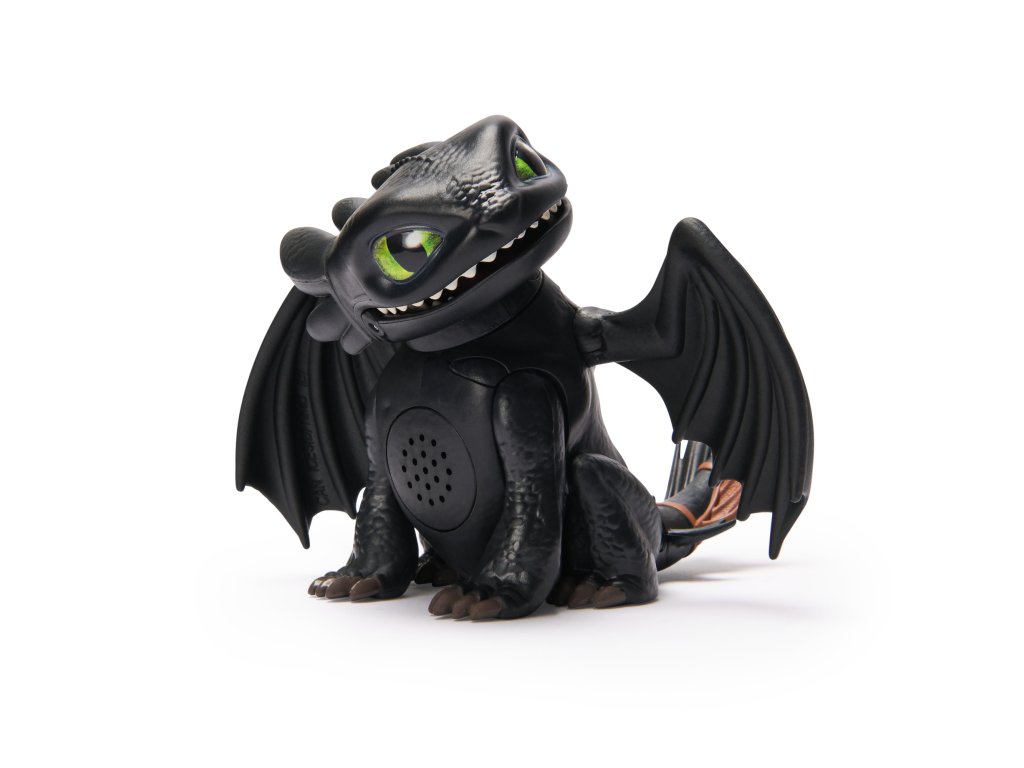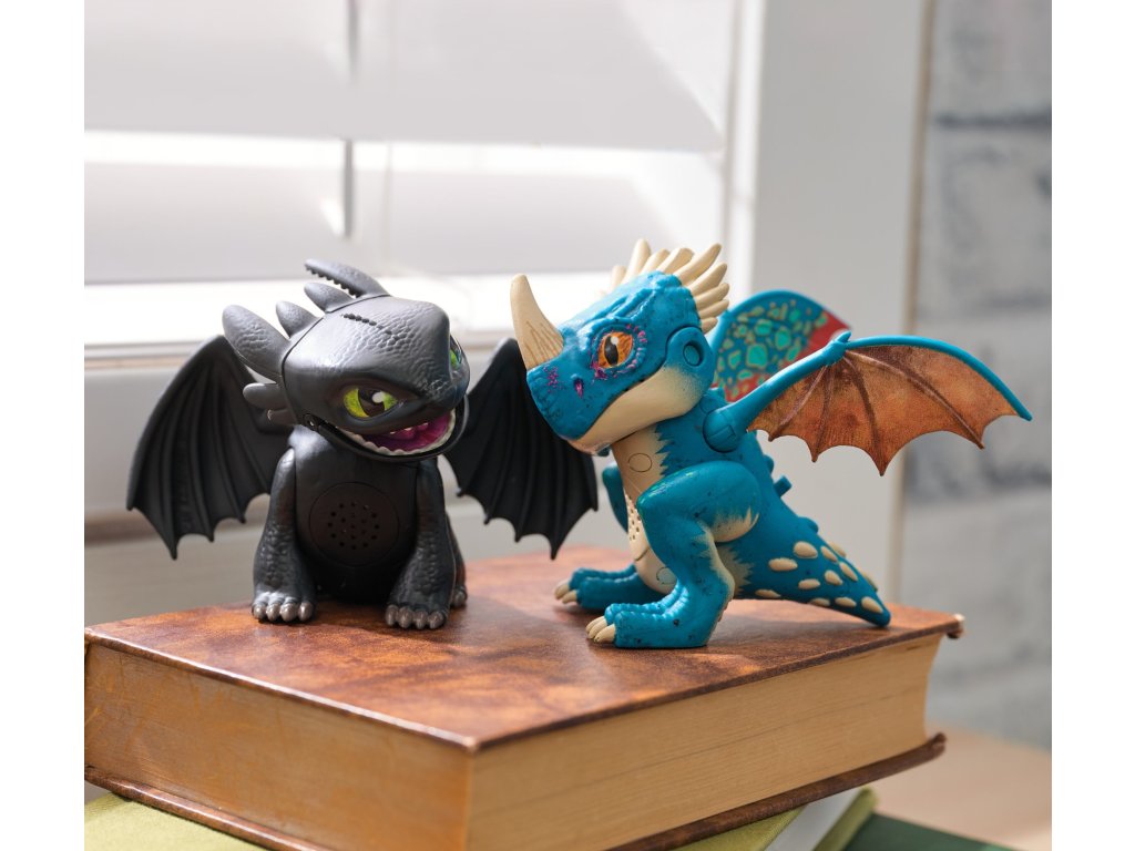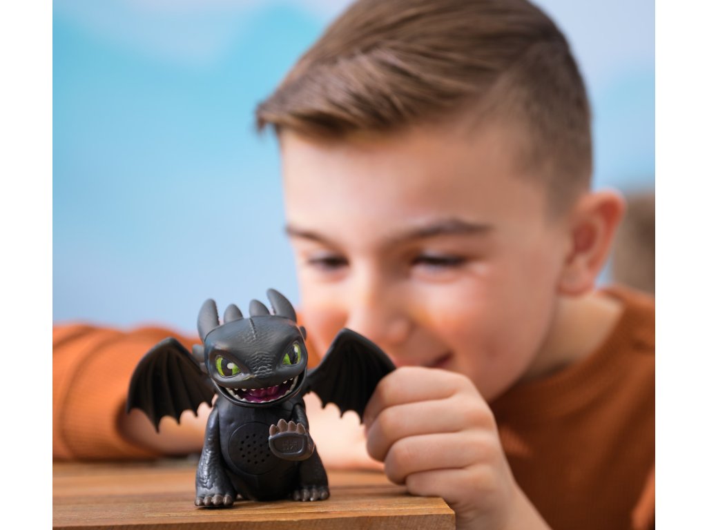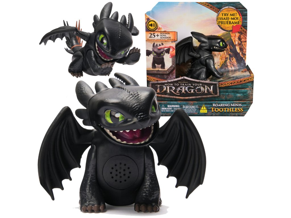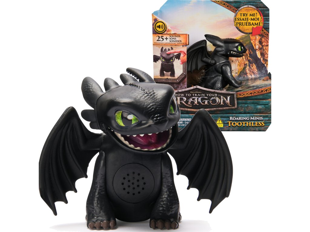 Roaring Minis Toothless je interaktivní drakBezzubý , který ožívá s realistickými pohyby hlavy a nastavitelnými křídly a více než25 různými zvukyspouštěnými dotykem.