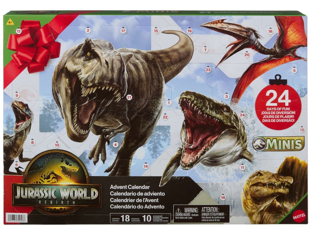 Adventní kalendář je v pastelových barvách a zdobí ho barevná grafika zobrazující realistické dinosaury z filmu. Pod barevnou grafikou je 24 otevíracích oken, která skrývají tematická překvapení . Mezi překvapeními jsou figurky dinosaurů a doplňky. Po shromáždění veškerého příslušenství můžete znovu vytvořit scény z filmu.