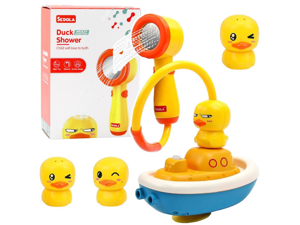 Sada obsahuje sprchu, která po aktivaci pumpuje vodu a uvolňuje proud jako skutečná sprchová hlavice. Provoz na baterie zajišťuje plynulý a pohodlný provoz. Vyměnitelné hlavice kachniček mají různé výrazy obličeje, což dodává rozmanitost a umožňuje vám vytvářet si vlastní scénáře.