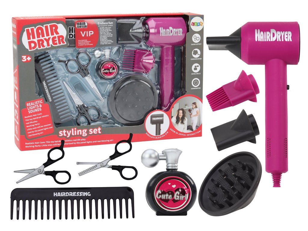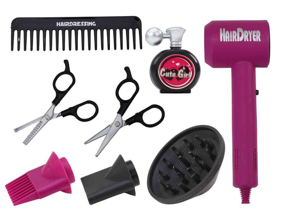 Sada obsahuje také nůžky na stříhání vlasů, rovné i vroubkované, umožňující různé účesy a efekty. Dlouhý černý hřeben usnadňuje česání a úpravu vlasů a dodává hře realističnost. Imitace flakonu s flakonem parfému a VIP karta pro kadeřníka dodávají hře další kouzlo a potěšení a umožňují dětem vytvářet si vlastní jedinečné styly.
