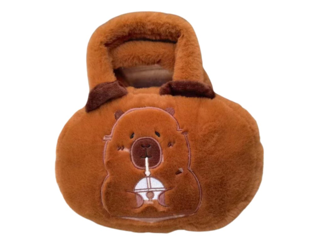 Taška je vyrobena z heboučkého hebkého plyše v teplé, hnědé barvě, která jí dodává útulný charakter. Přední stranu zdobí vyšívaná kapybara pijící drink brčkem - vtipný a milý motiv, který upoutá pozornost a dodává taštičce jedinečné kouzlo. Pro větší bezpečnost uložených věcí je taška vybavena zipem, který chrání obsah před nechtěným vypadnutím. Pohodlná měkká rukojeť umožňuje pohodlné nošení tašky v ruce a vysoká kvalita použitých materiálů zajišťuje dlouhou životnost a komfort používání.