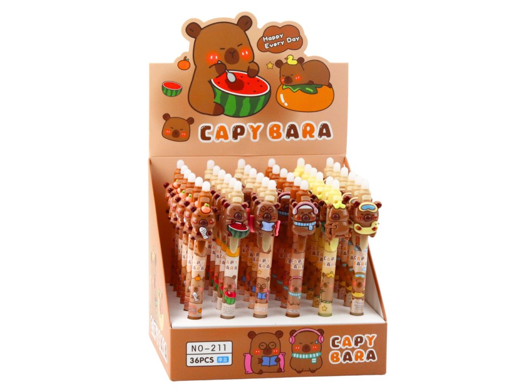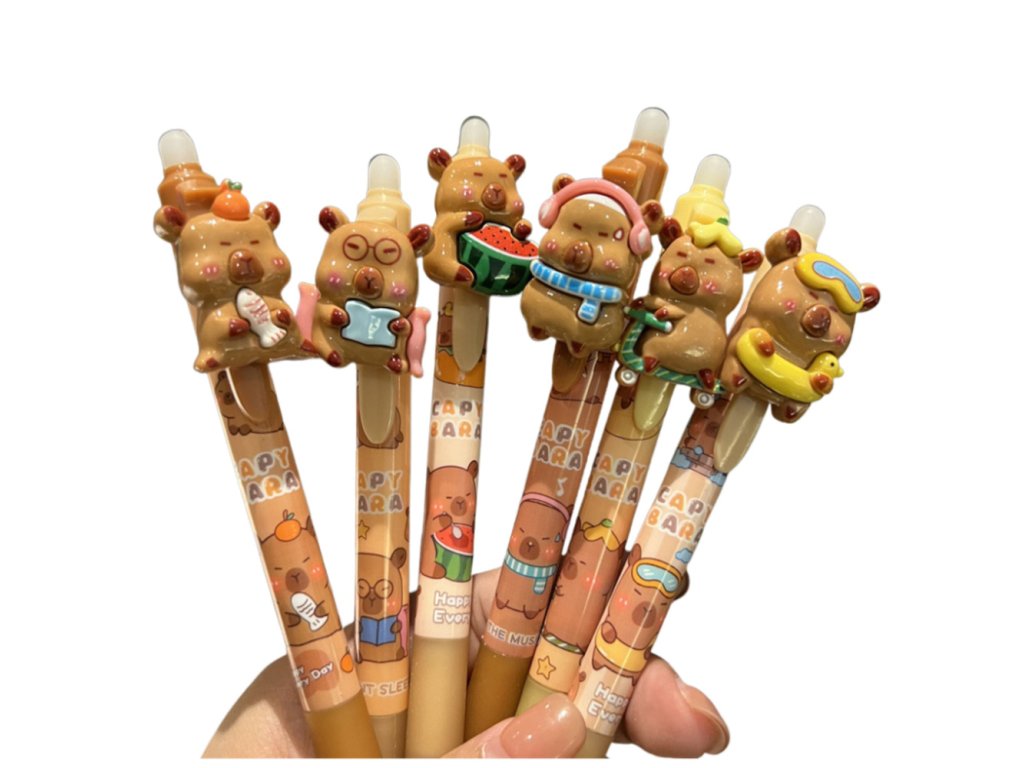Toto vysouvací kuličkové pero s motivem kapybary je funkční a okouzlující psací nástroj, který jistě osloví děti, mladé dospělé a fanoušky kapybar. Nahoře sedí ozdobná 3D figurka kapybary v různých hravých stylech – například s melounem, hrnkem nebo s brýlemi. Figurky jsou měkké a pružné, vyrobené z gumy.