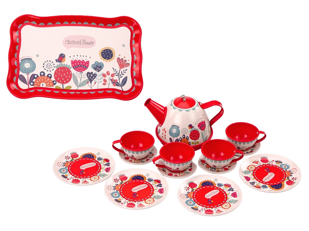 Sada hraček do kavárny je roztomilá a barevná sada, která umožňuje dětem hrát si na hostitele kávové party. Sada obsahuje elegantní podnos, konvičku, čtyři šálky, čtyři podšálky a čtyři velké dezertní talíře. Vše je laděno do krásné červené barvy a každý prvek sady je zdoben půvabnými květinovými motivy, což jí dodává jedinečné kouzlo.