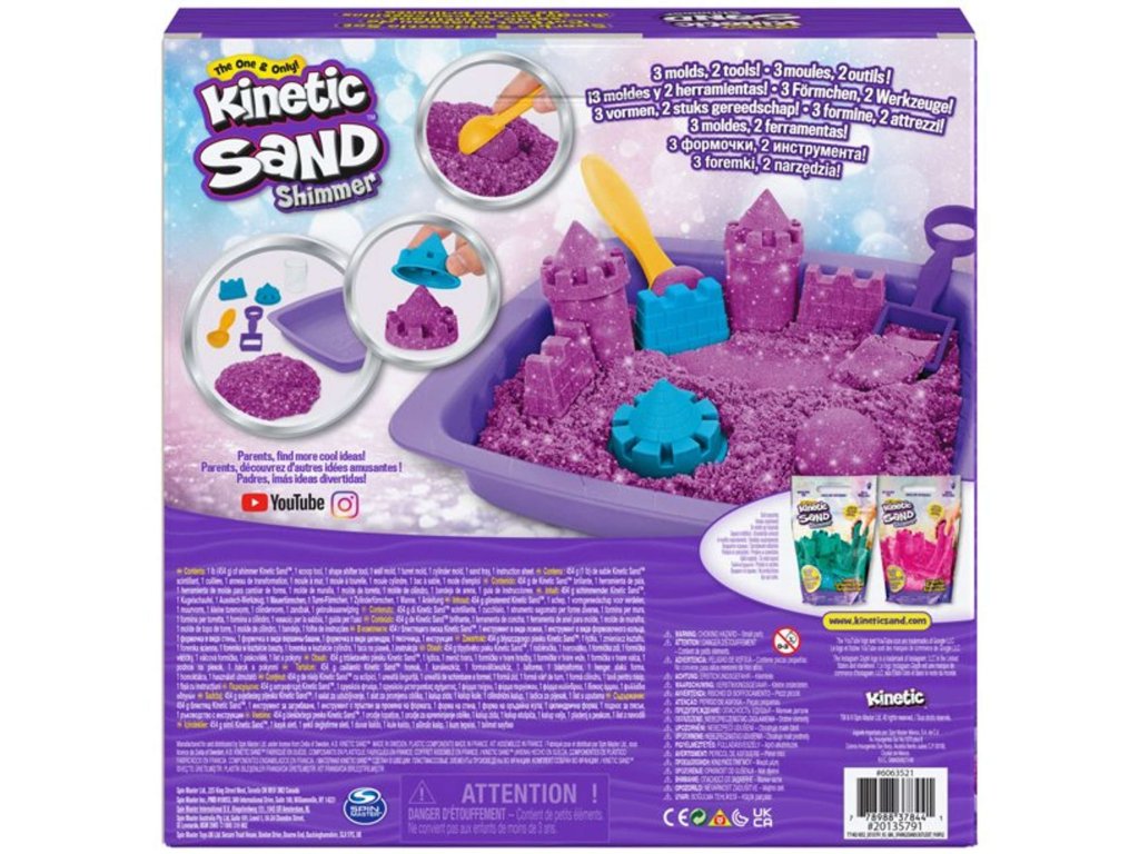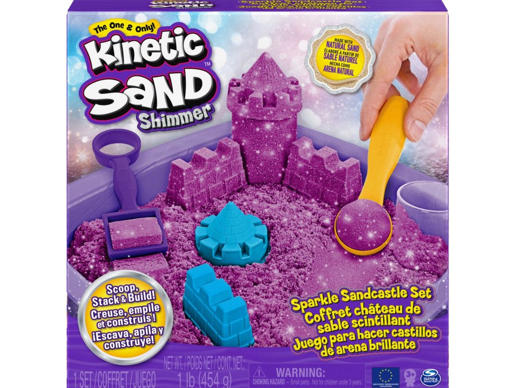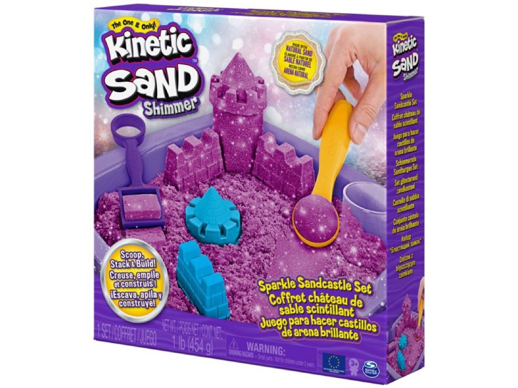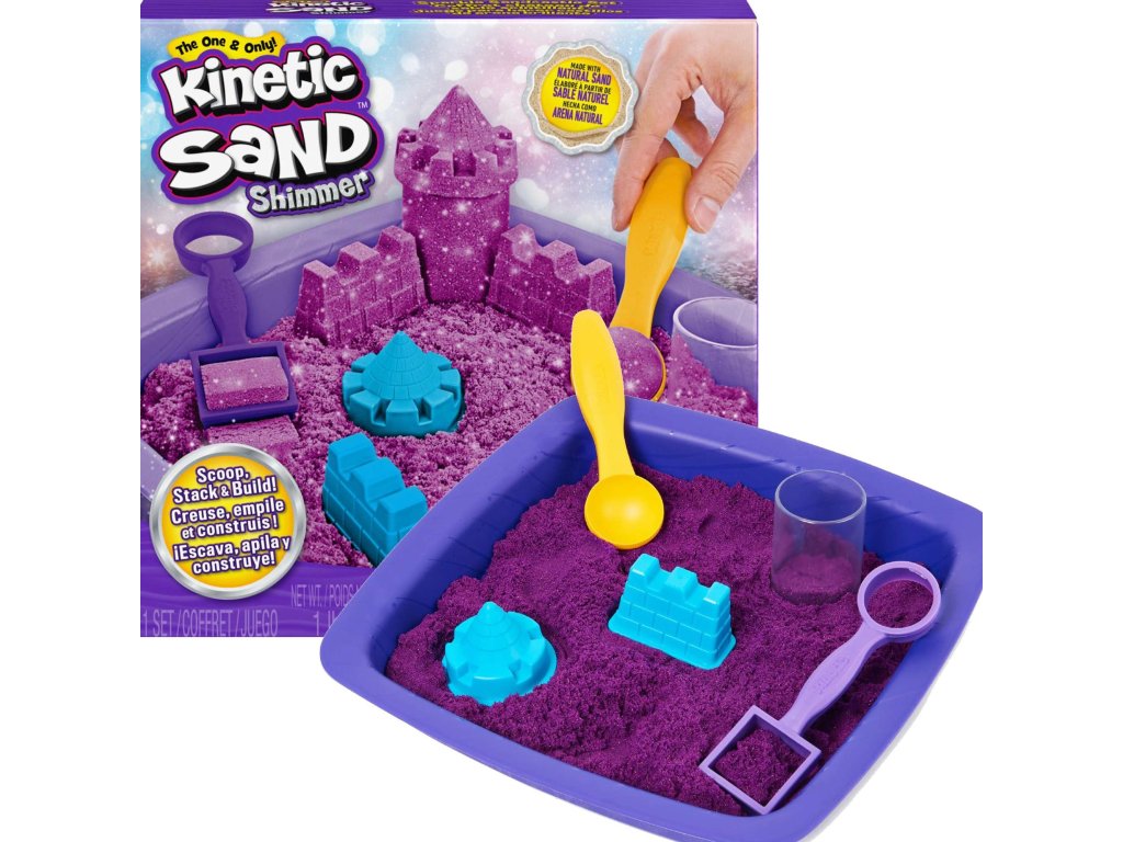 Sada obsahuje lesklý fialový kinetický písek se třpytkami, 1 tác na písek, 3 formičky ve tvaru hradních prvků, 2 zařízení na dělení pískua návod. Díky této sadě bude dítě moci vytvářet krásné budovy a hrady.