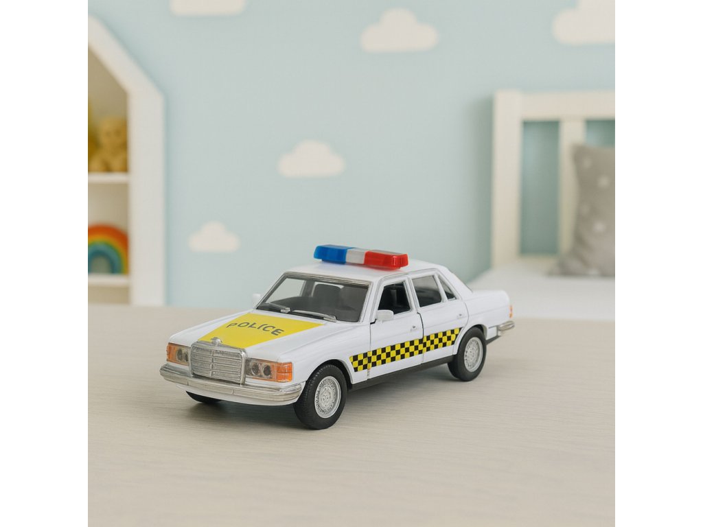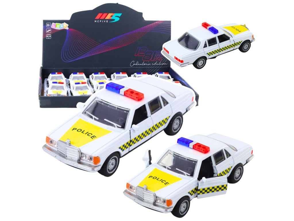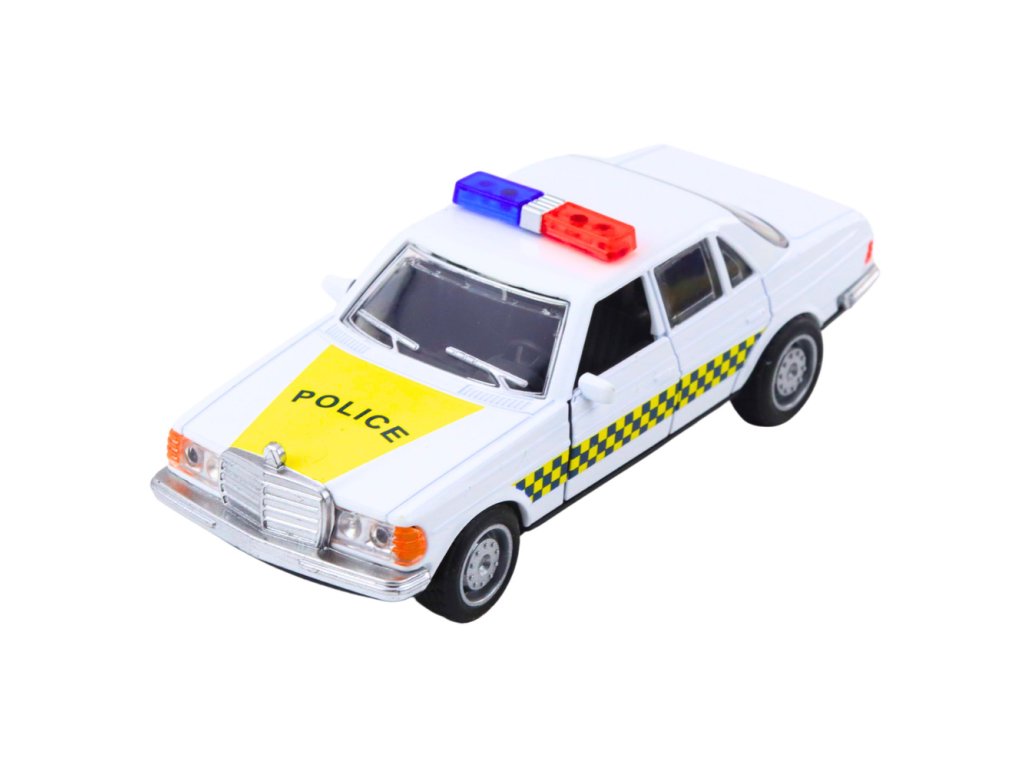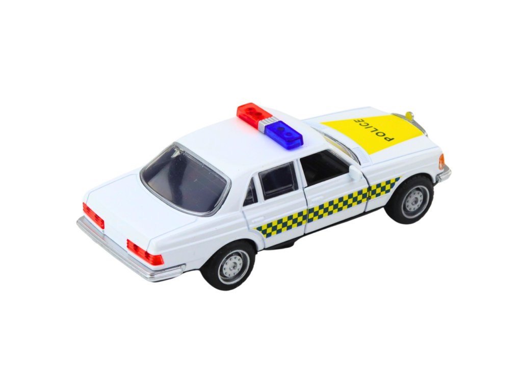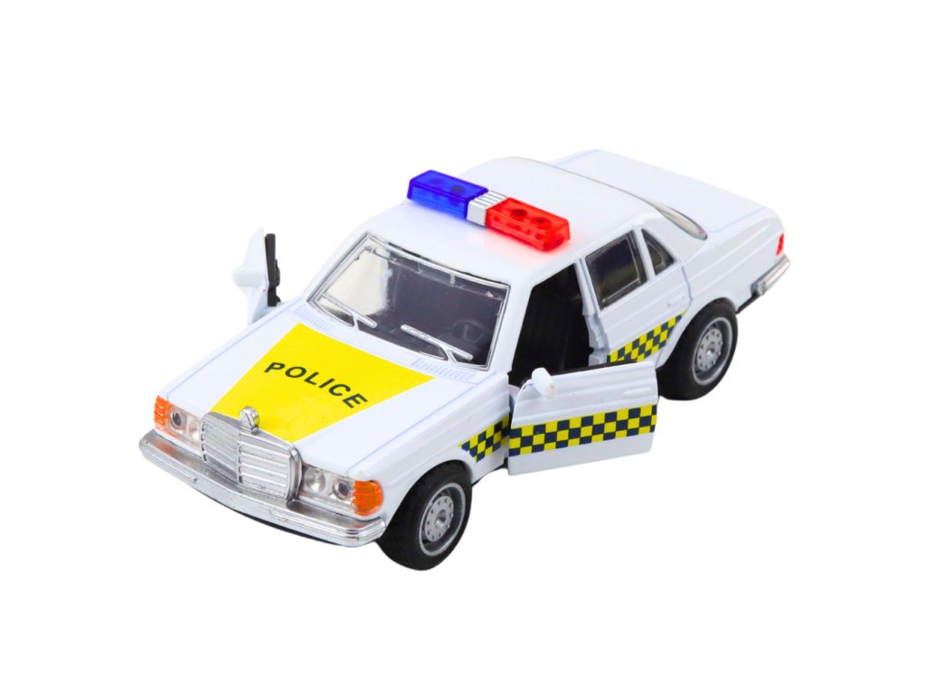 Klasické policejní auto – kovový model s otevíracími dveřmi, bílé 1:32