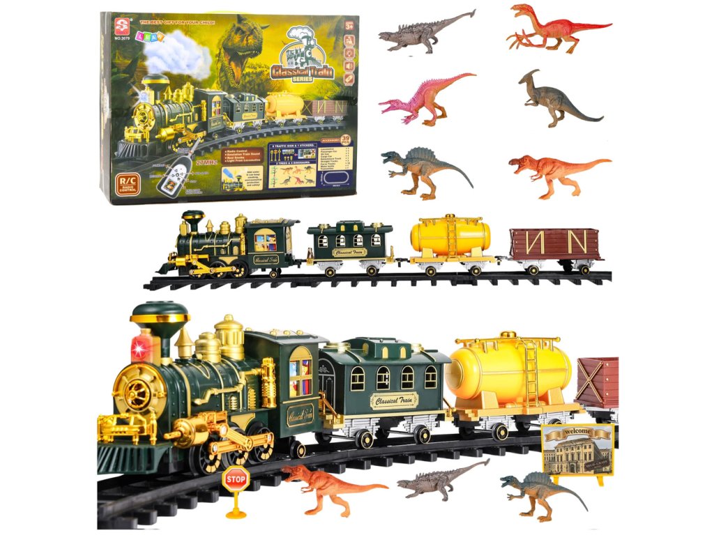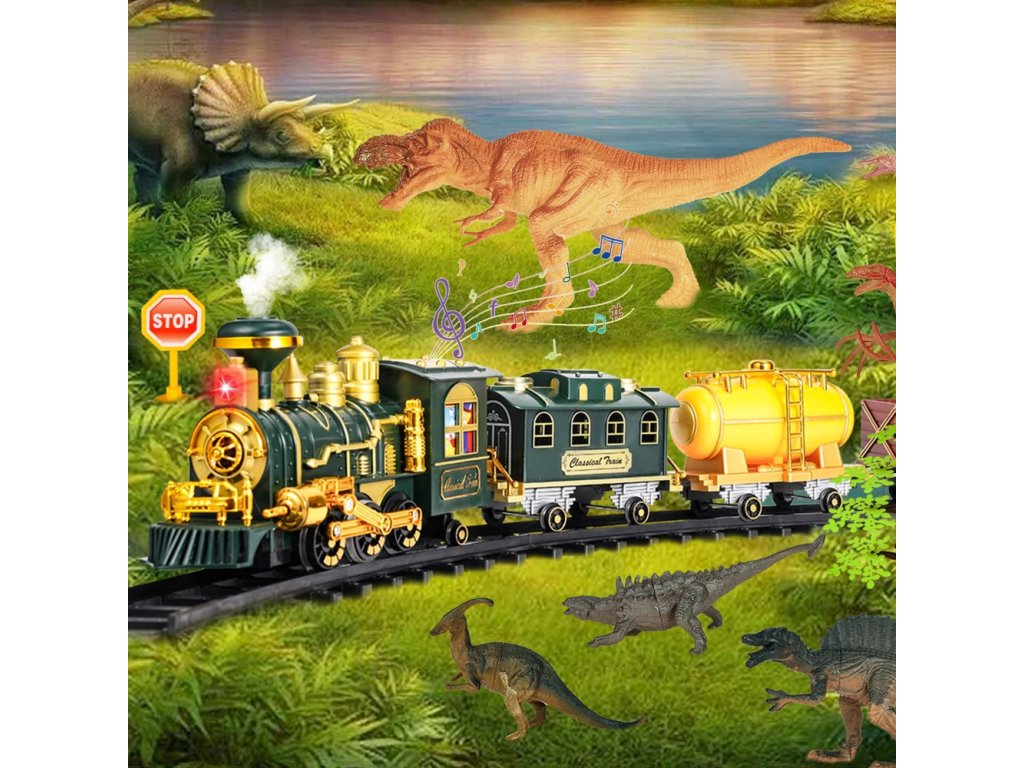Sada obsahuje figurky dinosaurů, dopravní značky, stromy a další doplňky, které vytvářejí kompletní tematickou kulisu. Děti si mohou postavit vlastní svět, organizovat přepravu zdrojů a hrát si na různé scénáře, ve kterých vlak jede po vyznačených kolejích obklopený prehistorickými tvory. Součástí sady je dálkové ovládání s frekvencí 27 MHz, které umožňuje ovládat pohyb vlaku, měnit směr a rychlost a také aktivovat zvuky napodobující skutečný vlak. Lokomotiva je také vybavena světelným efektem, který ještě více zvyšuje realističnost hry.