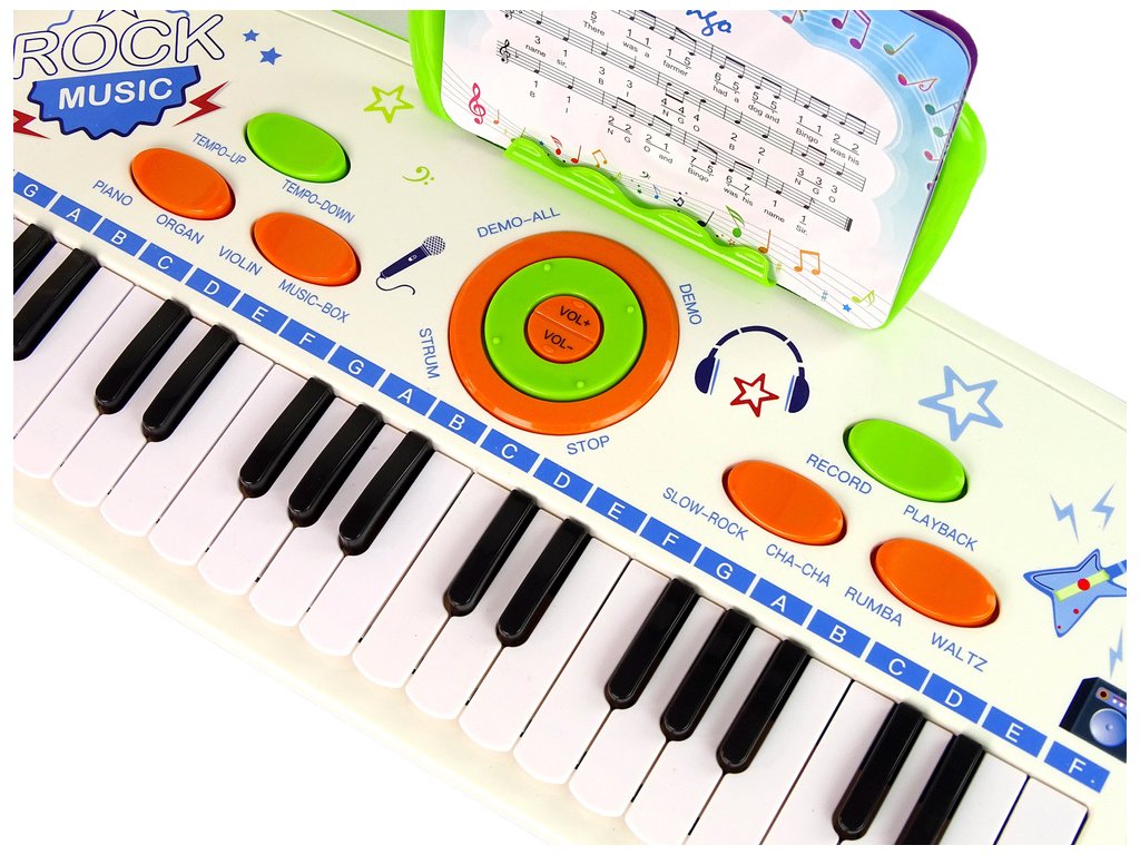 Celá klávesnice je bohatě vybavená a nabízí velké možnosti. Nástroj má funkci nastavení tempa, různé rytmické funkce, které vám umožní vytvářet vlastní melodie. Přiložené noty vám pomohou udělat první kroky ve vašem hudebním dobrodružství. Na zadní straně nástroje jsou MP3 a USB vstupy, takže můžete připojit externí média.