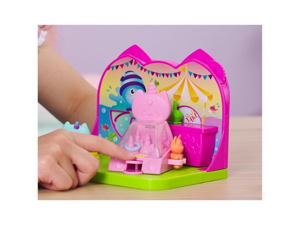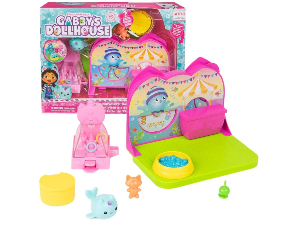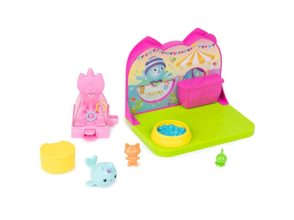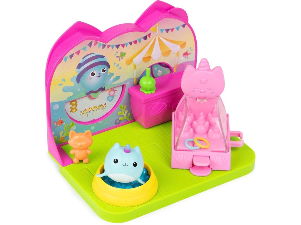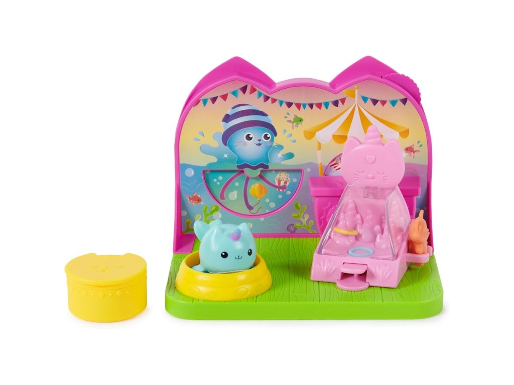 Sada karnevalového pokoje Gabby's Cat House 20144381Připravte se na zábavu a vzrušení s Narwhal Kitty v sadě Carnival Room Set! Tato sada obsahuje rozkošnou figurku narvalské kočičky, kouli, házení kroužkem, snack bar a další! Umístěte Narval Kitty do míčové jámy, vyzkoušejte své štěstí ve hře házení prstenem a vyhrajte cenu, poté otočte číselníkem a změňte scenérii! Pak, stejně jako Gabby na začátku každé epizody, rozbalte speciální balíček a odhalte překvapivé karamelové jablko!