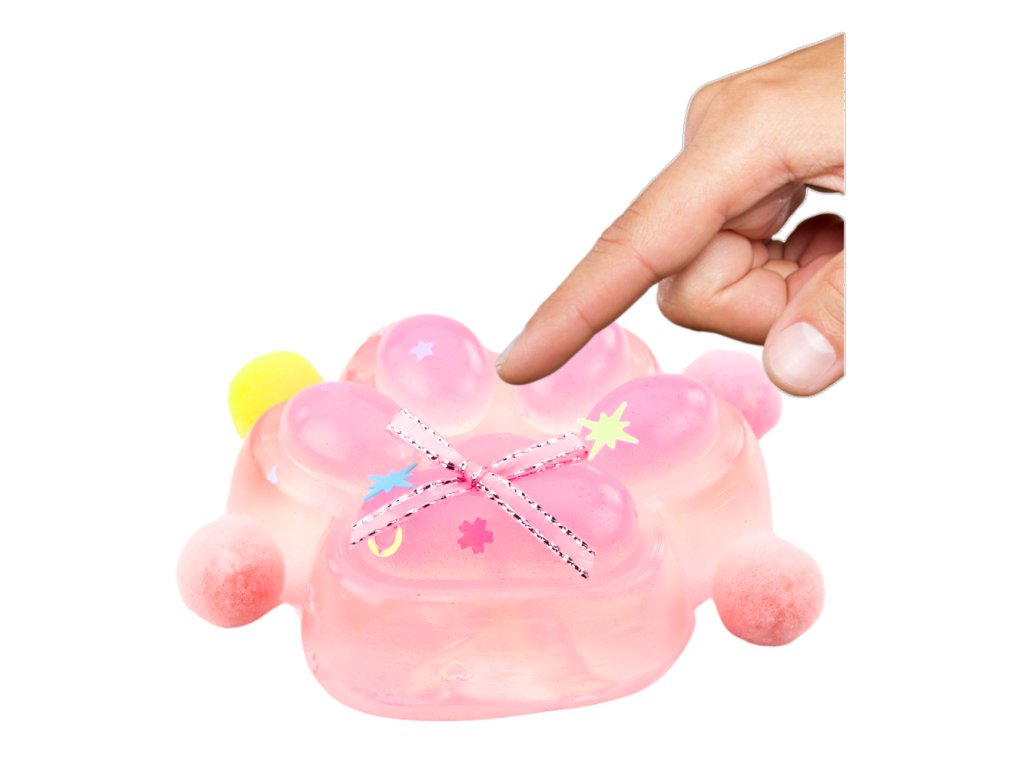 Model se vyznačuje průhlednou úpravou s barevnými konfetami zasazenými uvnitř ve tvaru hvězd, srdíček a květin. Ozdobná mašle na přední straně a barevné bambulky dodávají celku elegantní, dárkový charakter. Squishy krásně padne do ruky a poskytuje různé hmatové podněty, které podporují zklidnění a koncentraci.