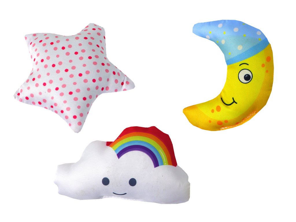 - 3 plyšové přívěsky (měsíc, mrak, hvězda)