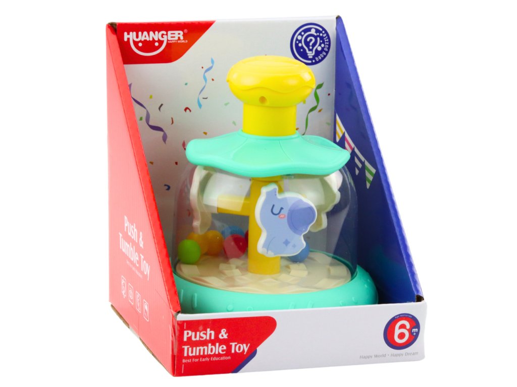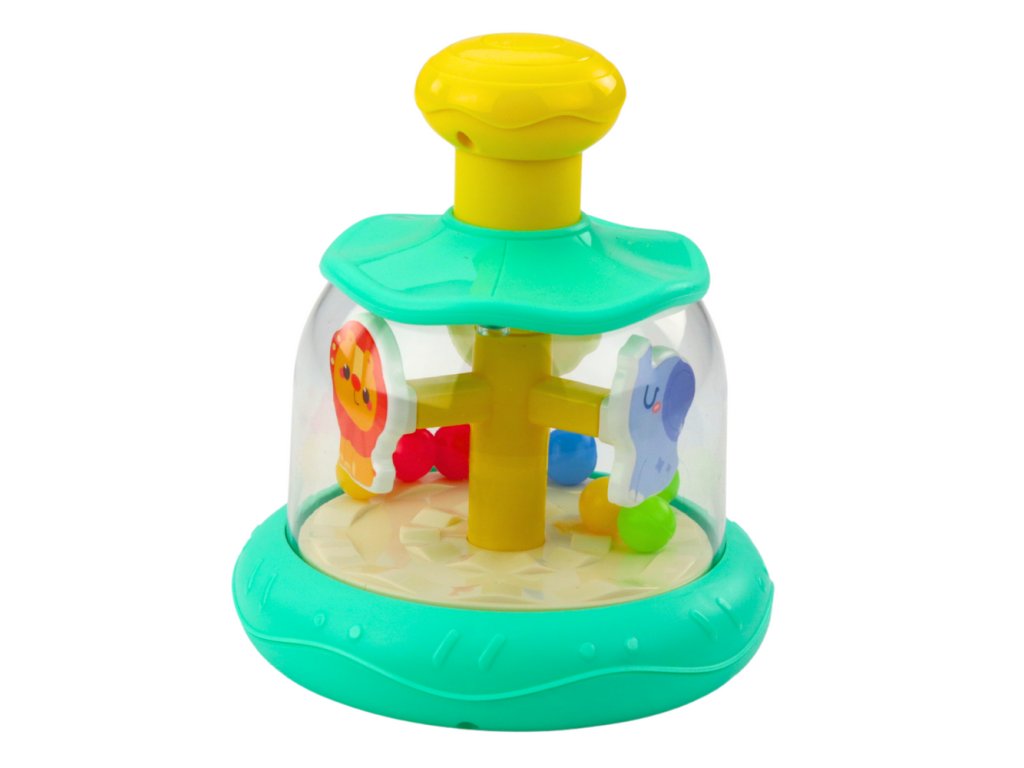 Po stisknutí žlutého tlačítka na horní straně se káča dá do pohybu a zvířátka se začnou otáčet kolem vlastní osy a vytvoří tak dynamický, barevný kolotoč. Hračka zapojuje zrak, sluch a pohyb dítěte a zároveň rozvíjí koordinaci ruka-oko a chápe vztah příčiny a následku.