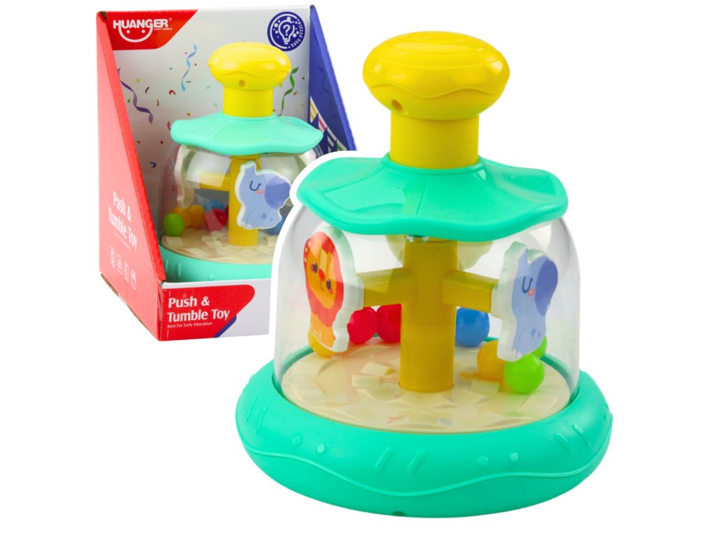 Kroucená kolovrátek s kuličkami je zábavná a vzdělávací hračka pro děti od 6 měsíců. Zelený model obsahuje rotující figurky: hrocha, lva a opice a je doplněn barevnými kuličkami, které se během hry pohybují uvnitř průhledné kopule.