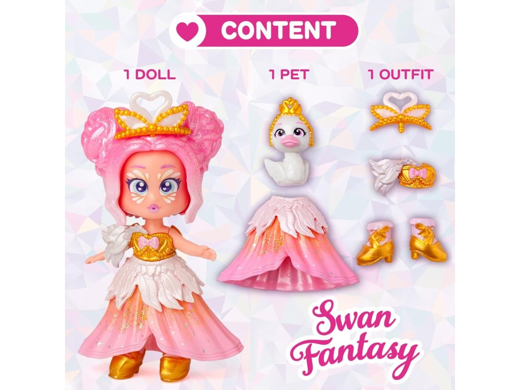 Objevte světSwan Fantasy– zasněné princezny s jemným stylemElegance , která miluje taneční balet a vždy ji doprovází její rozkošná nejlepší kamarádka labuť.Swan Fantasyje celý život o cestování mezi paláci a kouzelnými lesy a její lesklé, třpytivé účesy a pohádkové outfity jsou připraveny na ples nebo procházku lesem!