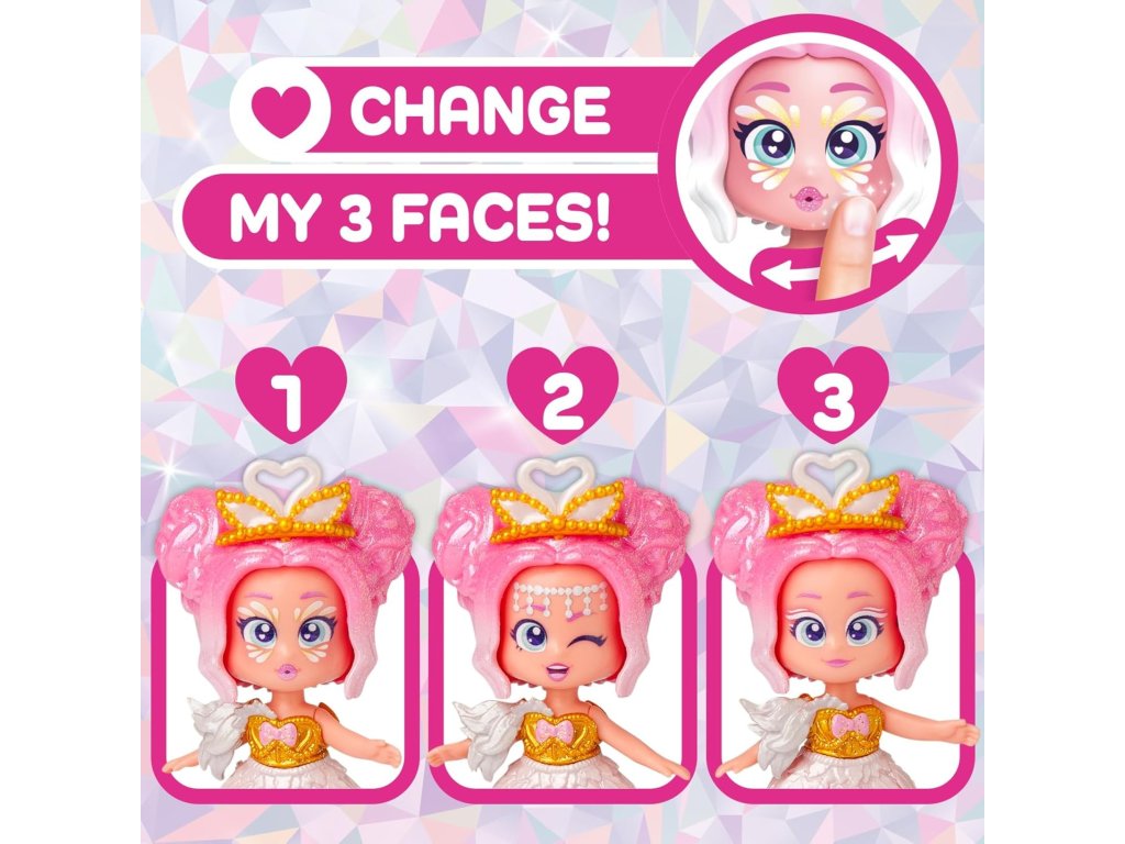 - 3 výrazy obličeje: jedním kliknutím změňte výraz své princezny – od šťastného úsměvu, přes zasněný pohled až po zvědavé překvapení.
