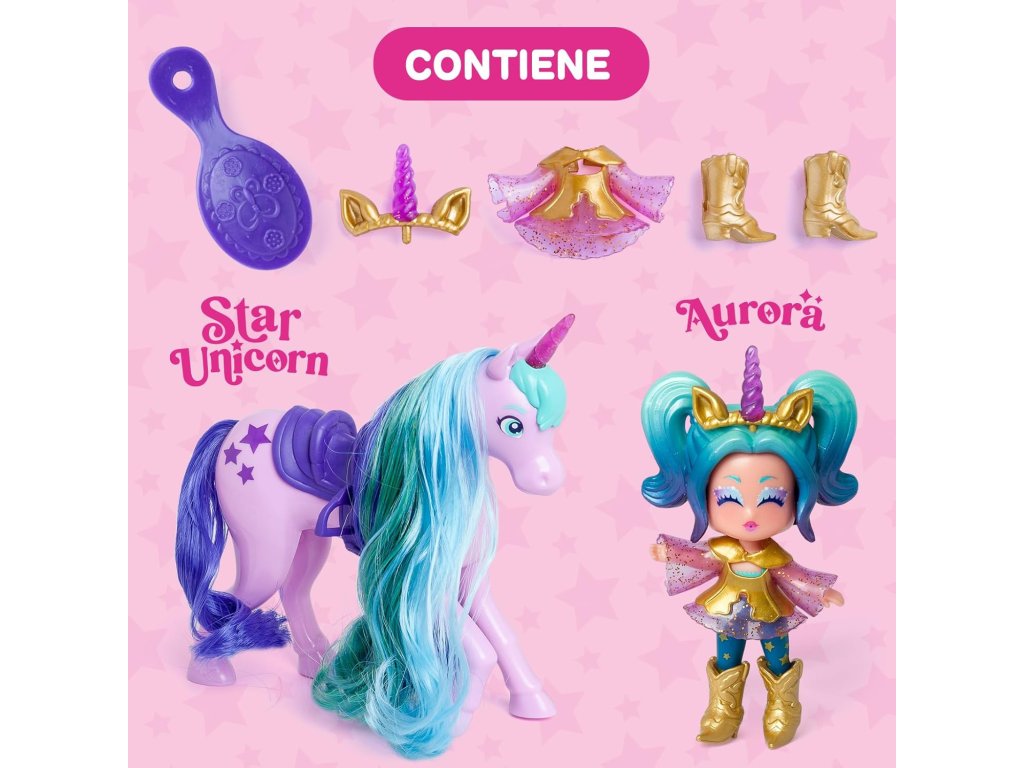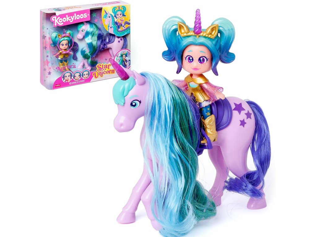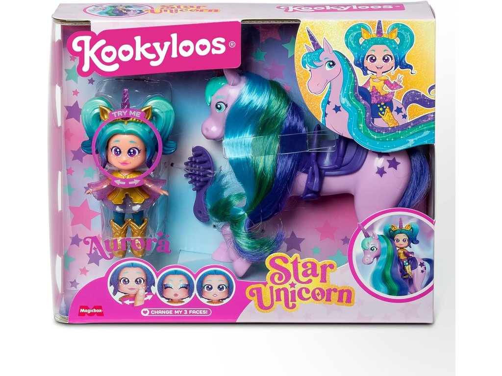 Toto je jedinečné duo KookyLoos:panenka Auroraa její kouzelný jednorožecHvězda. Hříva Star je vyrobena z pravých vlasů, které můžete česat a upravovat dle libosti pomocí přiloženého kartáče. Aurora a Star jsou společnost připravená na tisíce dobrodružství, která rozvíjí představivost a podporuje kreativní hru!