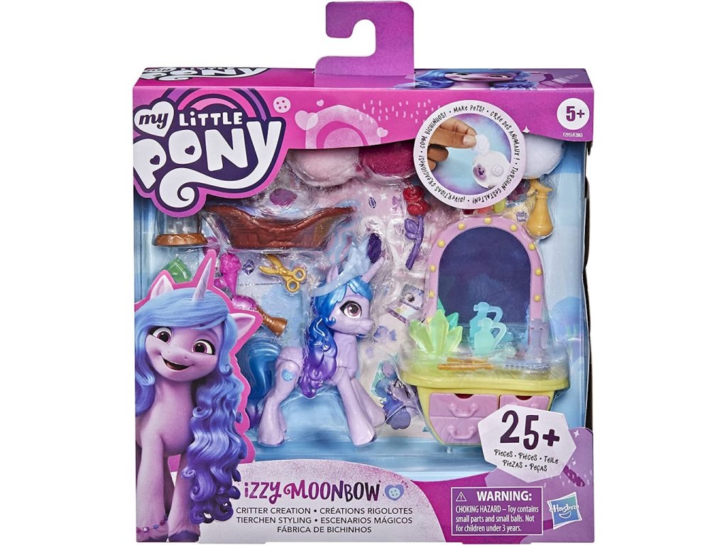 My little Pony je seriál o nejdůležitějším kouzlu ze všech - kouzlu přátelství. Twilight se vydává do Ponyville, kde má za úkol najít si přátele a naučit se přátelství. Se svými přáteli prožívá mnohá úžasná dobrodružství. Seriál je oceňován pro své humorné prvky a poučnost. Přestože byl určen malým holčičkám, získal si širokou základnu fanoušků i v teenagerovském věku.Izzy Moonbowová je optimistka, která ráda kutilství, tvoření a jiskření. Součástí sady je více než 25 doplňků, včetně zábavných doplňků, které dětem umožní vytvořit si vlastní zábavné bytosti. Součástí jsou 4 bambulky a 2 archy samolepek s očima, ušima a dalšími vzory. S takovou sadou se nemůžete nudit!