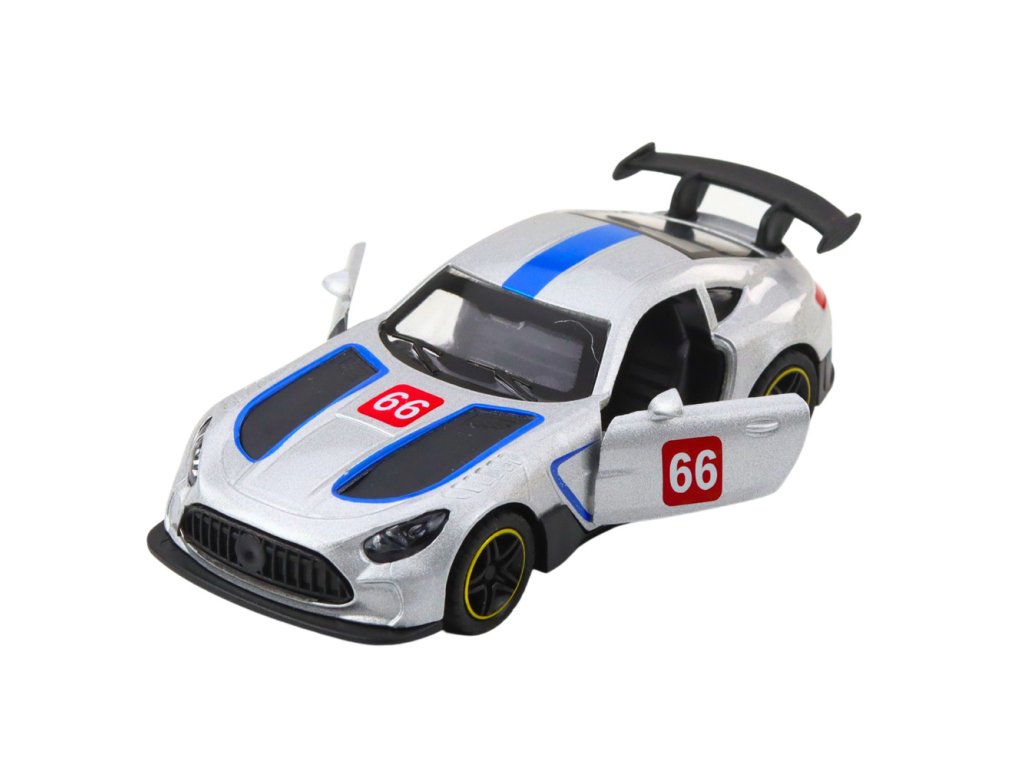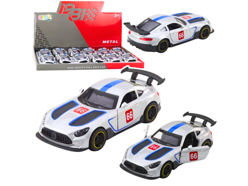 Kovové závodní auto s otevíracími dveřmi, stříbrné, 1:43
