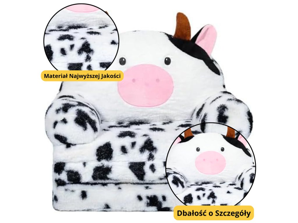 Dětské skládací křesílko ve tvaru legrační kravičky je jedinečný kus nábytku navržený s ohledem na pohodlí, bezpečnost a každodenní radost nejmenších uživatelů. Tříúrovňová konstrukce umožňuje nastavit výšku sedáku a také rychle přeměnit křeslo na praktické, měkké lehátko - ideální pro zdřímnutí, čtení pohádek nebo relaxaci po intenzivní hře.