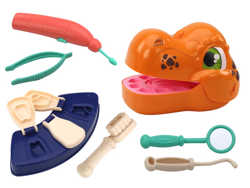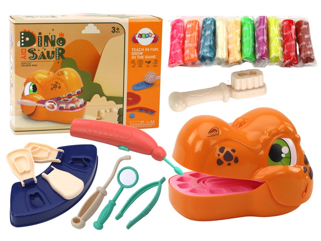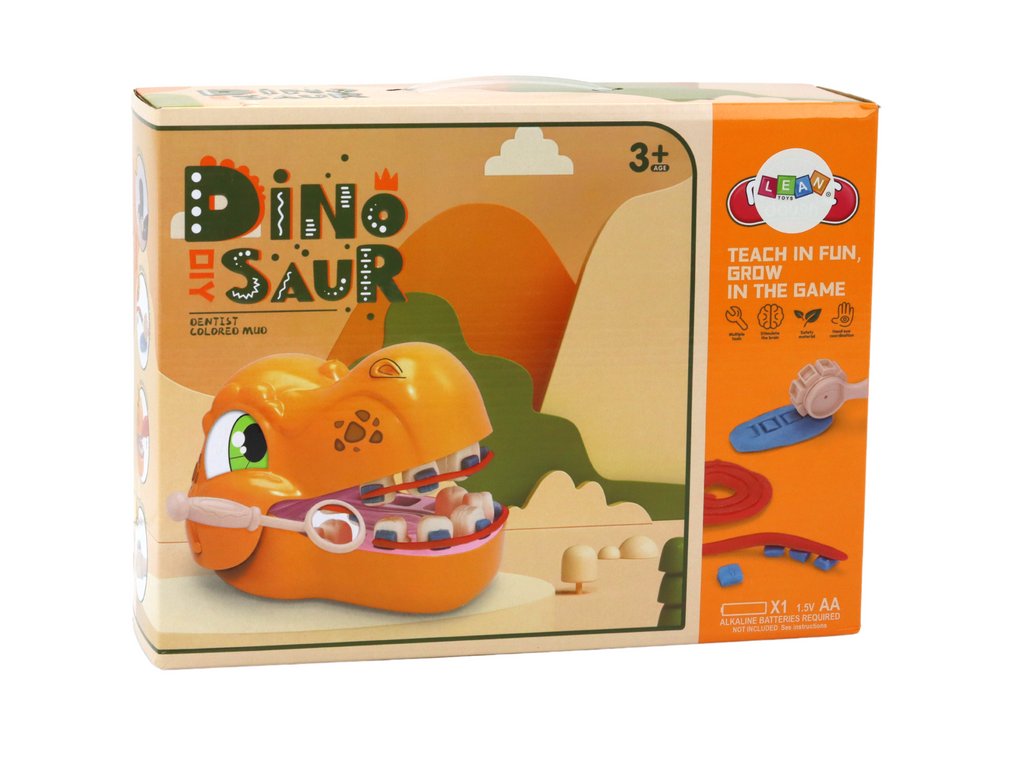 V balení najdete vše, co ke hře potřebujete: dinosauří hlavu, sáčky s barevnou plastovou hmotou, formičky na otiskování zubů, nástroj na otiskování ortodontických zámků a další potřebné dentální doplňky. Díky rozmanitosti prvků si děti mohou představit samy sebe jako profesionální zubaře a praktikovat různé stomatologické výkony.