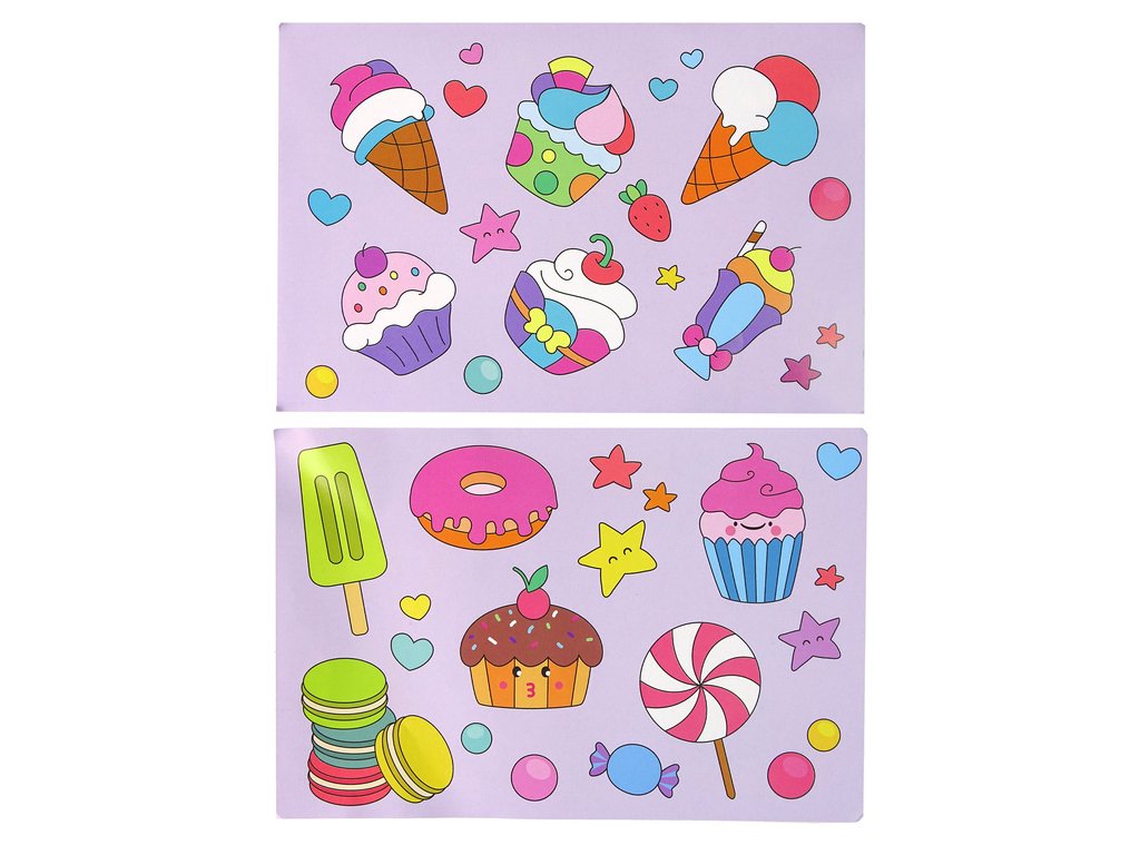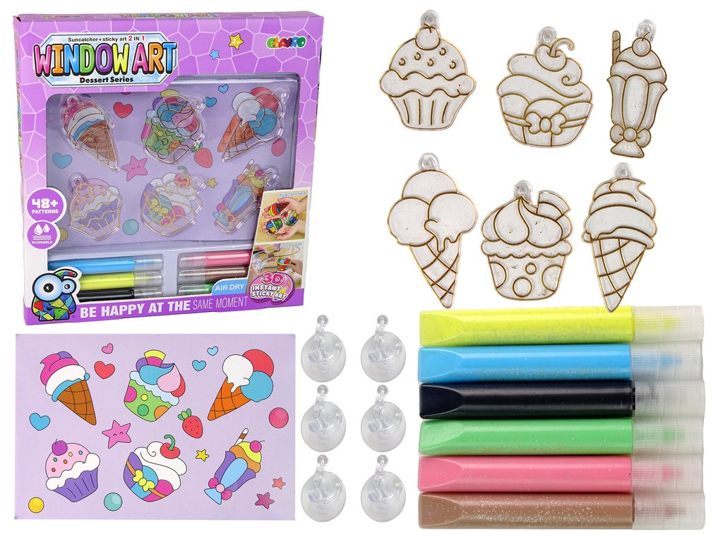 Součástí sady je také 6 vitrážových zmrzlin a grafik ve tvaru košíčků, které můžeme na sklo přilepit speciálními přísavkami.
