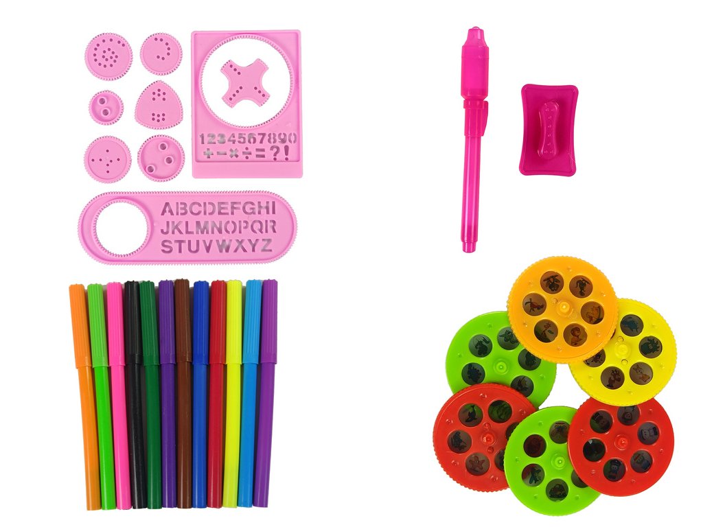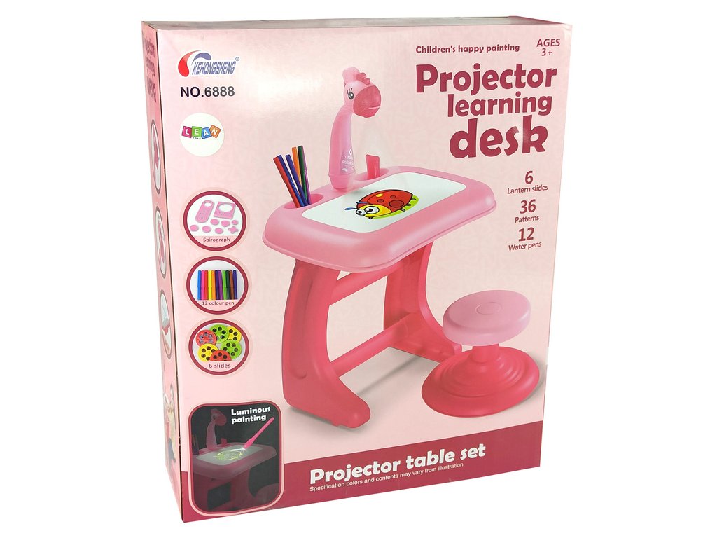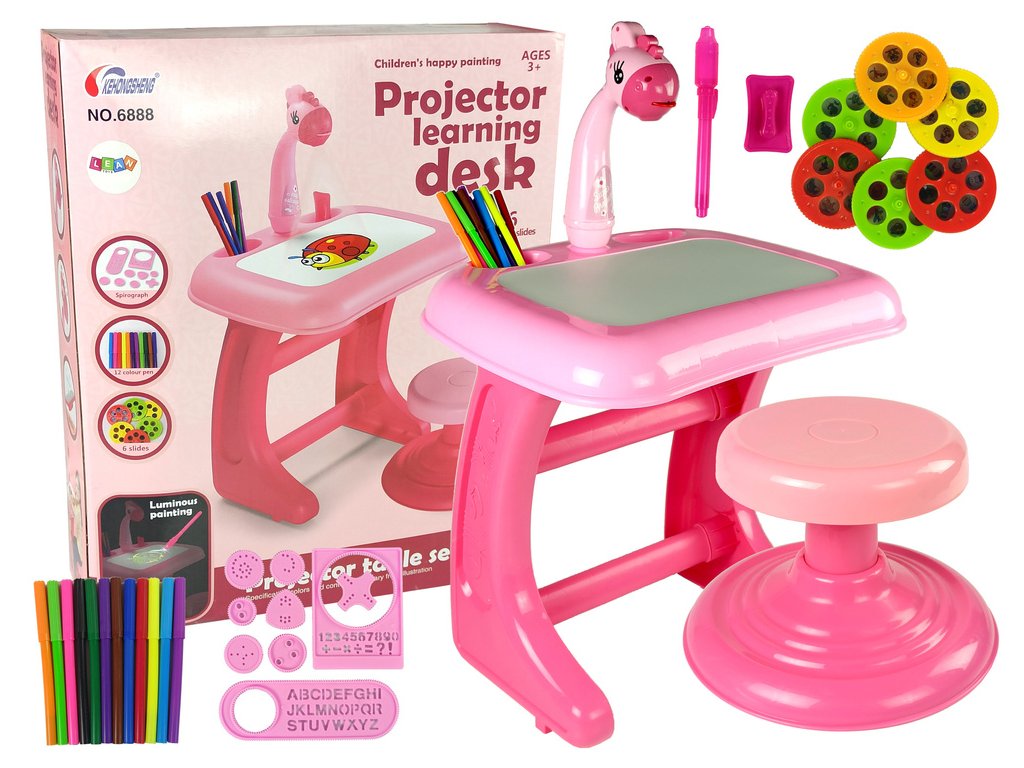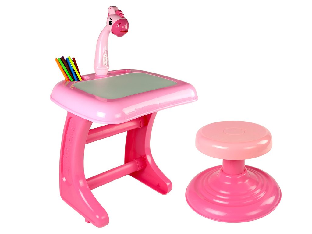 Součástí setu je i malý taburet, s jehož pomocí se vašemu dítěti bude u stolu pohodlně sedět. Sedák i taburet jsou laděny do růžových barev, bude perfektním doplňkem dekorace dětského pokoje. Na desce stolu jsou dvě malé šuplíky, kam schováte propisky v celé škále barev, vždy je máte na dosah. Projektor uprostřed stolu vypadá jako přátelská žirafa. Projektor uprostřed stolu připomíná přátelskou žirafu a zobrazuje různé obrázky zvířat a postaviček, které lze nakreslit na papír. Šablony v sadě naučí vaše dítě správně pojmenovávat geometrické útvary a psát písmena.