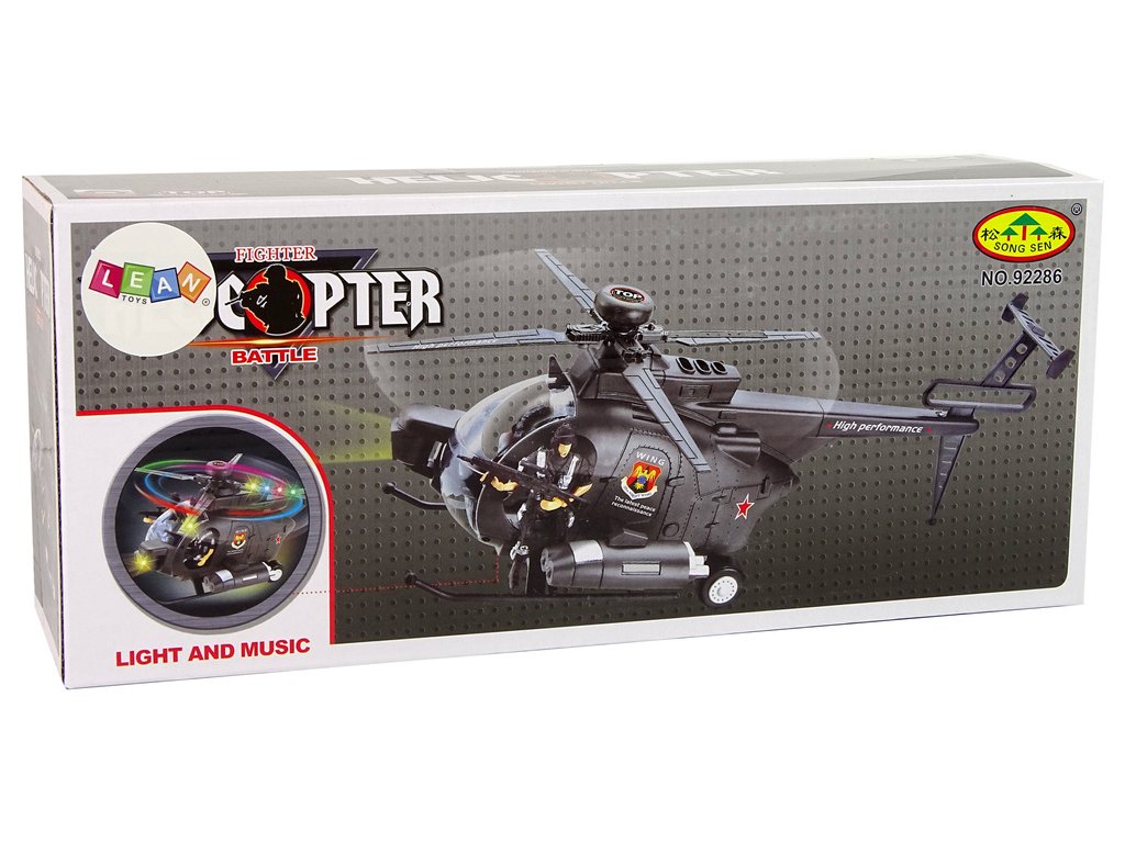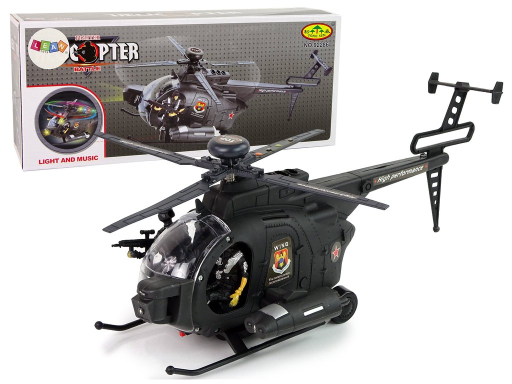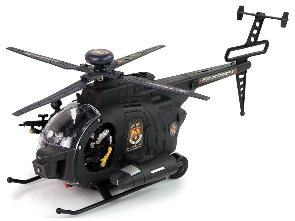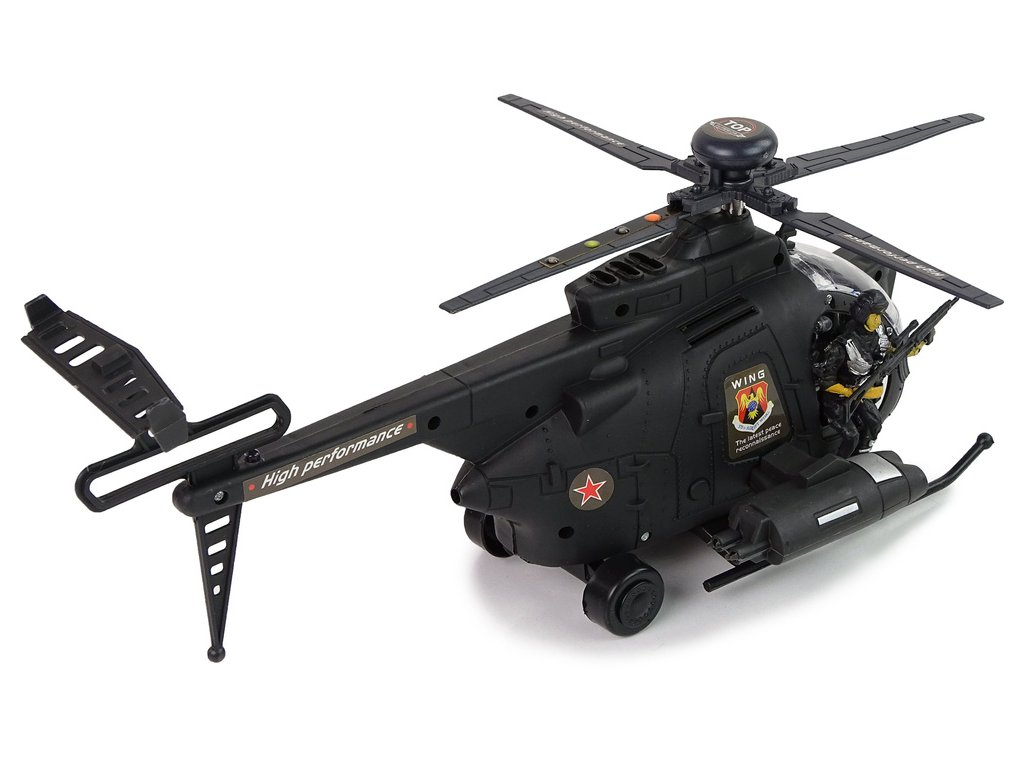 Vrtulník je veden v černých barvách, široký podvozek usnadní přistání. Díky široce rozmístěným křídlům s barevnými světly a zvuky na pozadí bude zábava realistická. Dvě komanda, jedno u ovládání, druhé připravené ke střelbě! Kola jsou namontována pod vrtulníkem, aby se vrtulník pohyboval.