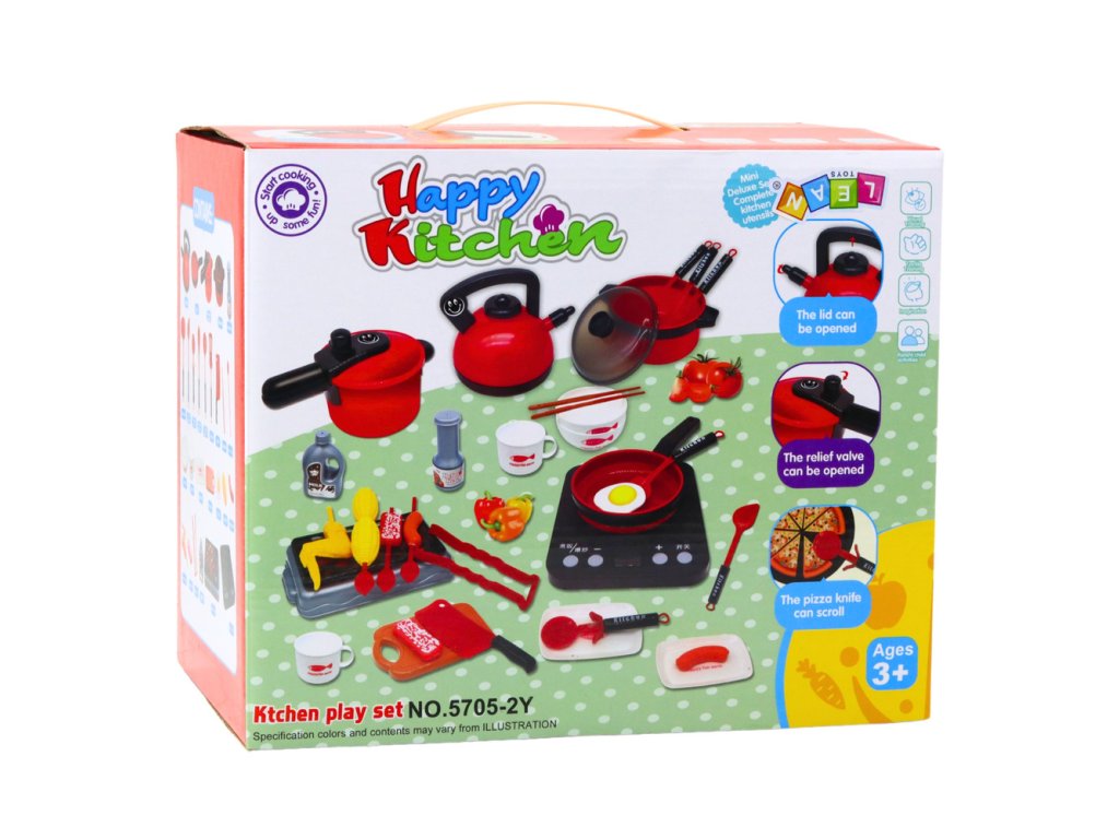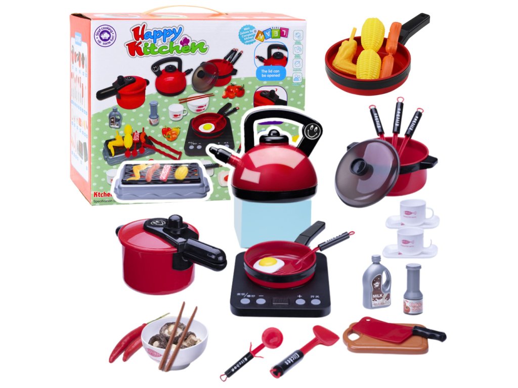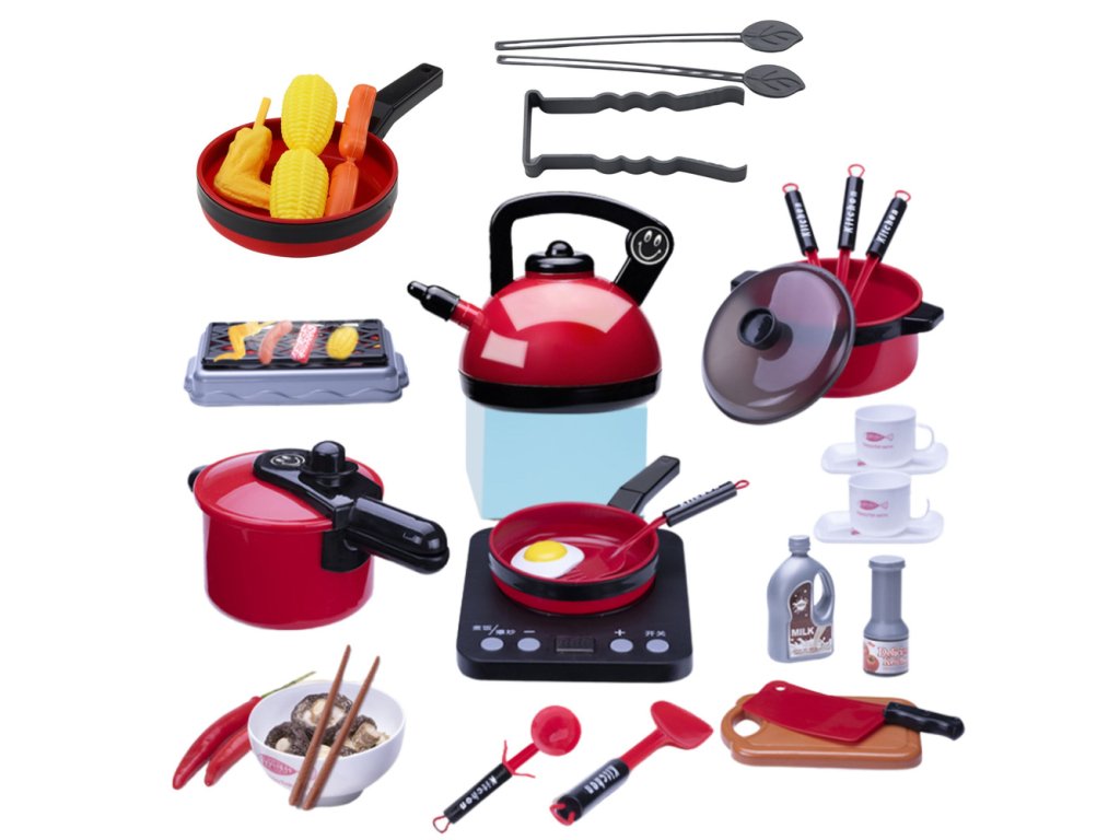 Kuchyňský set na vaření je unikátní nabídkou pro děti, které se rády vžijí do role kuchaře. Sada obsahuje až 36 prvků, které napodobují skutečné nádobí, kuchyňské náčiní a přísady do pokrmů. Najdeme zde mimo jiné rychlovarnou konvici, pánev, tlakový hrnec, hrnec s poklicí, gril, prkénko, sushi s hůlkami a pohyblivou plotýnku se zvuky smažení a vaření. Vše je vyrobeno s důrazem na detail a v atraktivních, červených a černých barvách.