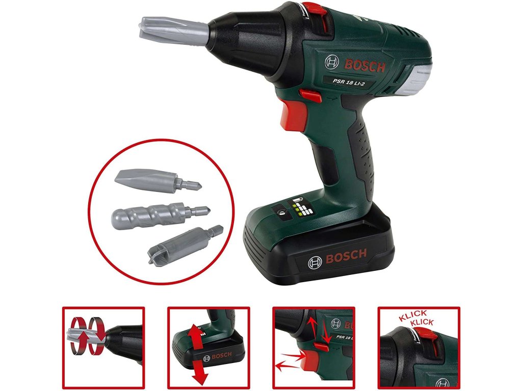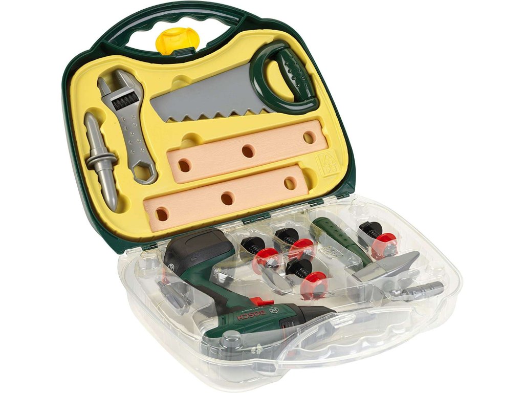 Uvnitř kufříku najdete vše, co malý kutil potřebuje - šroubovák, klíč, kladívko, čtyři velké černé šrouby, dva hřebíky, dvě speciální lišty s otvory&strong> na šroubování a hlavně - šroubovák Bosch, který je věrnou imitací svého skutečného protějšku.