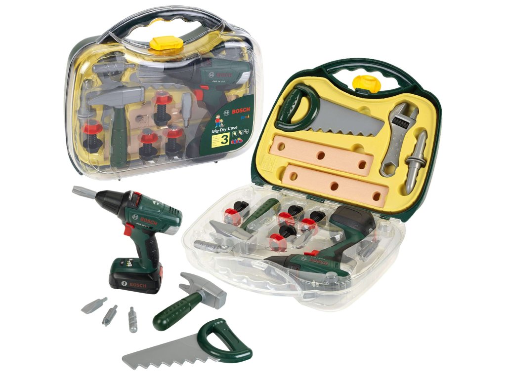 - sada se skládá z: kufřík na nářadí, šroubovák Bosch, kladivo, francouzský klíč, pilku, 2 lišty a šrouby a vruty