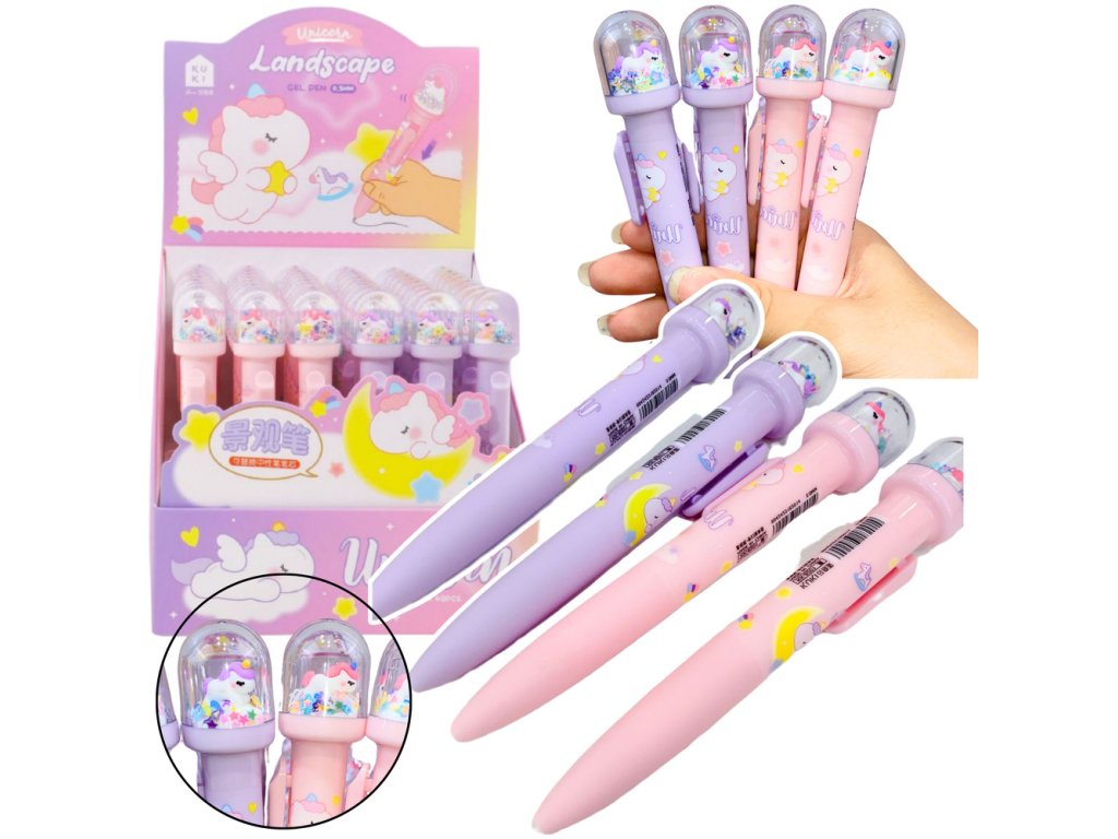 Okouzlující kuličkové pero s postavičkou a pohyblivými třpytkami je ideálním doplňkem školního setu pro děti a mládež. Pastelové barvy, pohádkové motivy a průhledná kopule s pohyblivými prvky ještě více zpříjemní psaní. Propiska vyniká jedinečným designem - figurka je umístěna v průhledném uzávěru obklopeném plovoucími hvězdami, třpytkami a dalšími dekorativními částicemi.