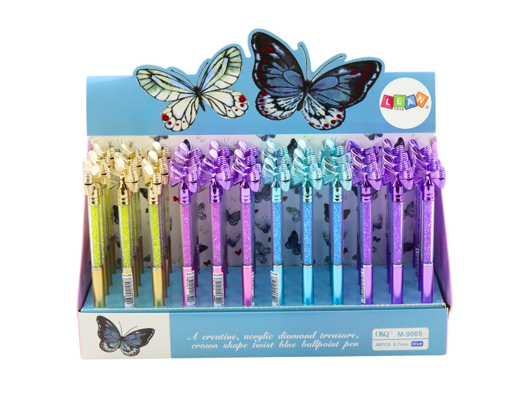 Toto jedinečné pero je kombinací elegance a funkčnosti. Na konci je mašlička, která mu dodává elegantní vzhled. Průhledné pouzdro vyplněné drobnými lesklými diamanty vytváří efektní odlesky světla, které podtrhují jeho luxusní charakter.