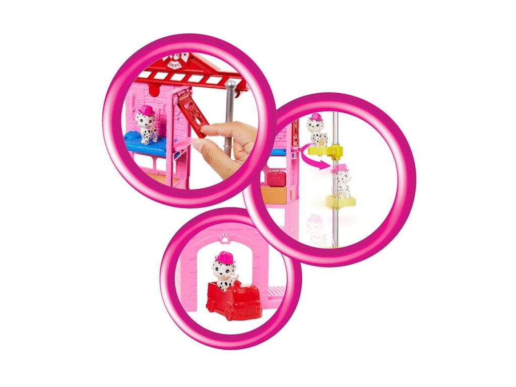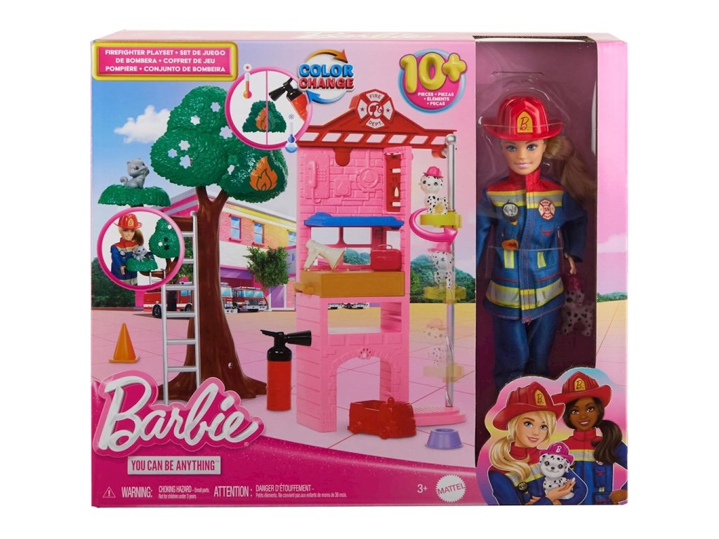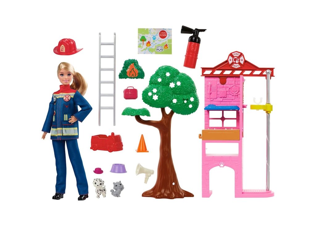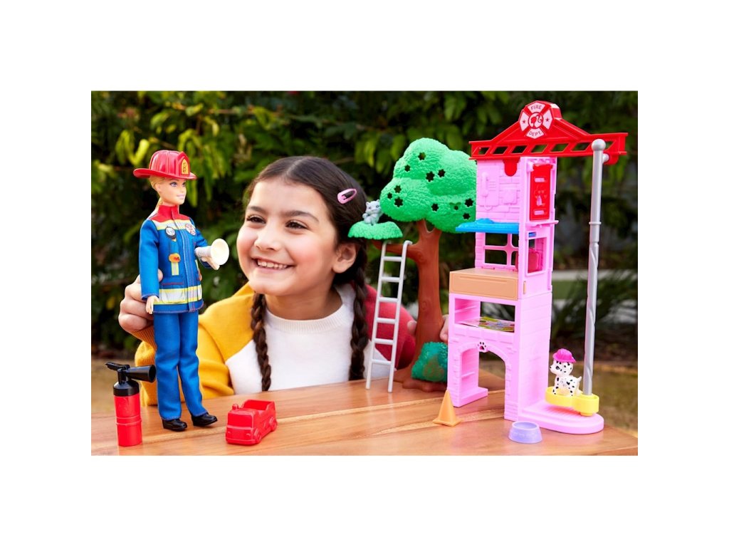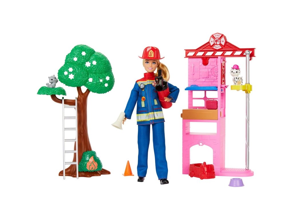 Panenka Barbie Firefighter Set Firefighter Fire Station HRG55Panenka Barbie Firefighter umožňuje dětem stát se hrdiny v sadě s hasičská zbrojnice a přes 10 "hasičských" doplňků. Uložit kotě uvízlé na stromě nebo "uhasit oheň" s doplňky jako je prvek „plamen“ měnící barvu, strom s otvory a hasicí přístroj – naplňte jej studenou vodou, abyste „uhasili oheň“. Panenka Barbie Hasička v hasičském oblečku a s megafonem je připravena k pohybu do akce s dalmatinem po vašem boku. Pes může vklouznout po potrubí dovnitř hasičská stanice a naskočte do vlastního hasičského auta a hurá do... zachránit.