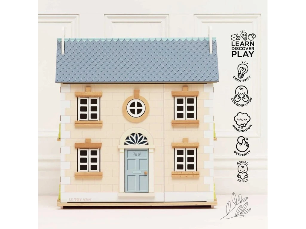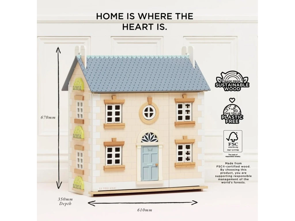 Dětské sny se s tímto krásným domečkem pro panenky mohou stát realitou. Nadčasová hračka děti inspiruje k představivé hře. Tradiční hračka je plná promyšlených detailů, je pomalována netoxickými pastelovými barvami na vodní bázi v odstínech růžové a šedé. Domeček má otevírací a zavírací okenice a dveře, podlahy z přírodního dřeva, dřevěné schodiště do prvního patra a vzorované tapety. Střechu je možné zvednout a objevit tak útulný podkrovní pokoj. Krásným detailem je malé kulaté okno. Hračka se bude vyjímat v každém dětském pokoji, můžete si ji předávat z generace na generaci. Ekologické hračky Le Toy Van jsou vyrobeny z odolných materiálů zkušenými řemeslníky, za použití etických praktik a udržitelných materiálů, které jsou laskavější k naší planetě. Dodává se bez vybavení, děti si tak mohou doplnit nábytek dle vlastního vkusu. Hračky s účelemVšechny hračky firmy Le Toy Van jsou vyrobeny s cílem – aby dlouho vydržely. Designovány s láskou zkušenými řemeslníky za použití etických praktik a udržitelných materiálů, které jsou laskavější k naší planetě. Hlavní vlastnosti: vyrobeno eticky ze dřeva s certifikací FSCneobsahuje plastytestováno dle nejpřísnějších standardůpomalováno netoxickými barvami na bázi vodyzabaleno v dárkové krabici s bavlněným ucheminspiruje k představivé hřerozvíjí kognitivní dovednostifigurky a nábytek se prodávají zvlášť (nejsou součástí domečku) Značka a certifikát FSC® (Forest Stewardship Council) zaručuje, že dřevo, ze kterého byl produkt vyroben, nebylo vytěženo nelegálně a pochází z lesů obhospodařovaných šetrným či přírodě blízkým způsobem, ve kterém jsou dodržovány přísné environmentální a sociální požadavky. Značka FSC® na výrobku znamená, že svým nákupem pomáháte chránit lesy a podporujete šetrné, odpovědné či přírodě blízké hospodaření, díky kterému jsou naše lesy stabilnější, zdravější, mají přirozenou druhovou skladbu a lépe odolávají negativním následkům klimatických změn.Doplňkové parametry