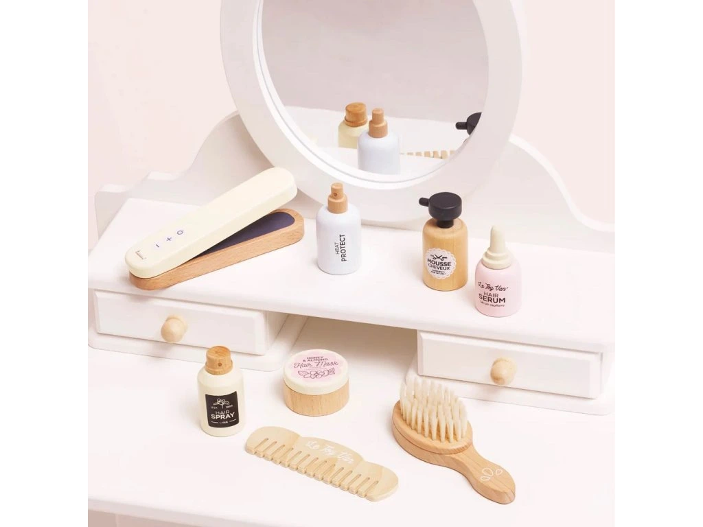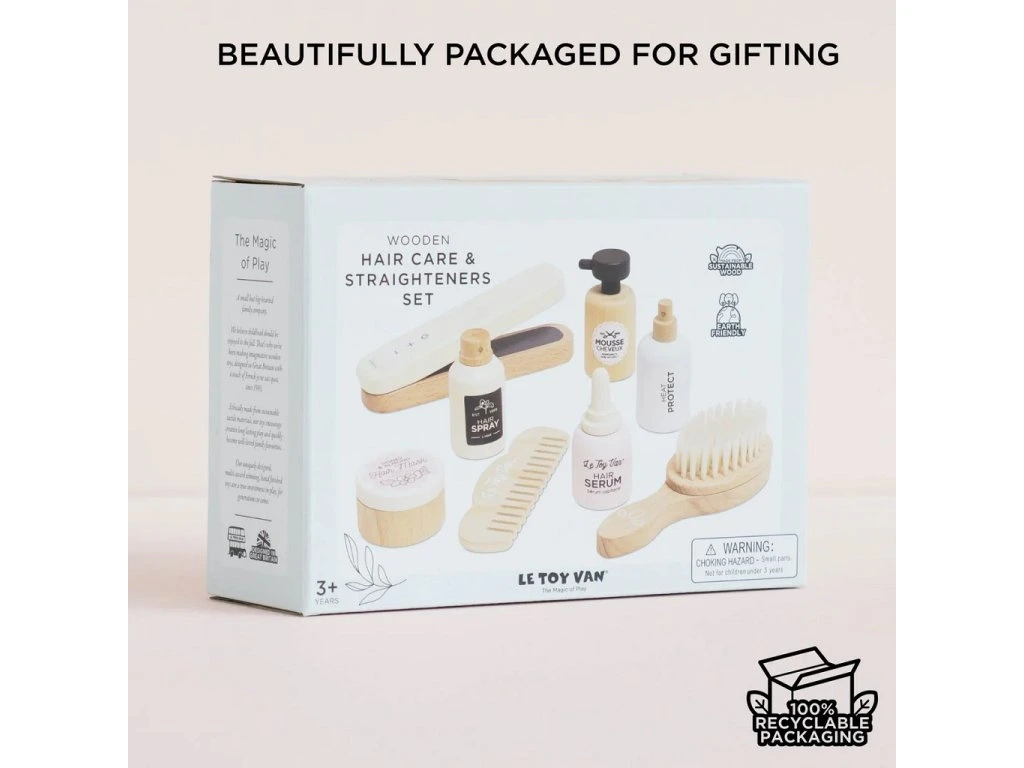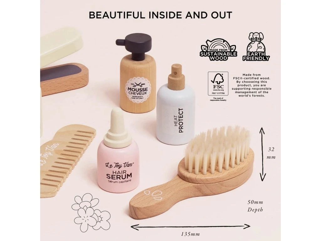 Hair Care & Straighteners Set, to je stylová sada pro malé kadeřnice a kadeřníky. Připravte se na hodiny dětské zábavy a kreativní hry s touto krásnou sadou. Ideální pro malé stylistky a stylisty, kteří milují hraní na kadeřnictví nebo salon. Hračka je navržena s ohledem na bezpečnost, kvalitu a dlouhodobou trvanlivost.Sada obsahuje žehličku na vlasy, hřeben, kartáč, a navíc detailní kosmetické doplňky pro fiktivní péči o vlasy jako jsou lahvičky se sprejem, maskou, sérem, pěnou, ochranným sprejem či lakem, což podporuje malé děti v představivém hraní a napodobování salónních procedur.Hra s touto sadou rozvíjí fantazii, sociální dovednosti a jemnou motoriku. Děti si mohou hrát na kadeřníky, upravit panenkám nebo kamarádům účes, kombinovat doplňky a vytvářet vlastní příběhy. Vyrobeno z certifikovaného dřeva FSC®, ručně malováno vodou ředitelnými netoxickými barvami a plně testováno podle přísných bezpečnostních standardů pro hračky. Hlavní vlastnosti: obsahuje 8 ksvyrobeno z FSC® dřeva ideální první kadeřnická/beauty sada rozvíjí kreativitu, představivost a jemnou motorikupodporuje hraní rolí, sociální interakci a manuální dovednosti Značka a certifikát FSC® (Forest Stewardship Council) zaručuje, že dřevo, ze kterého byl produkt vyroben, nebylo vytěženo nelegálně a pochází z lesů obhospodařovaných šetrným či přírodě blízkým způsobem, ve kterém jsou dodržovány přísné environmentální a sociální požadavky. Značka FSC® na výrobku znamená, že svým nákupem pomáháte chránit lesy a podporujete šetrné, odpovědné či přírodě blízké hospodaření, díky kterému jsou naše lesy stabilnější, zdravější, mají přirozenou druhovou skladbu a lépe odolávají negativním následkům klimatických změn.Doplňkové parametry
