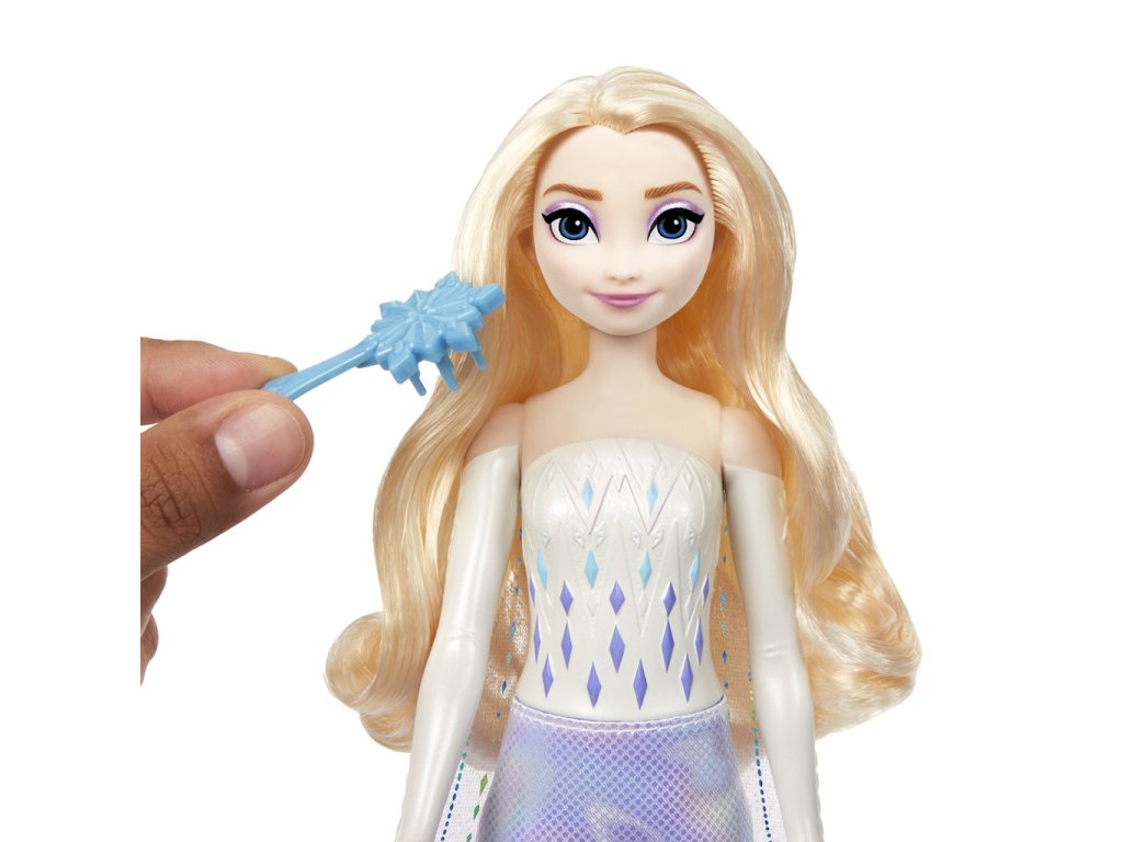 • Posledním překvapením je krásná panenka Elsa s jemnými dlouhými vlasy, odnímatelnou sukní a pláštěnkou a módními doplňky, jako jsou boty a kabelka, které vytvářejí královský vzhled.