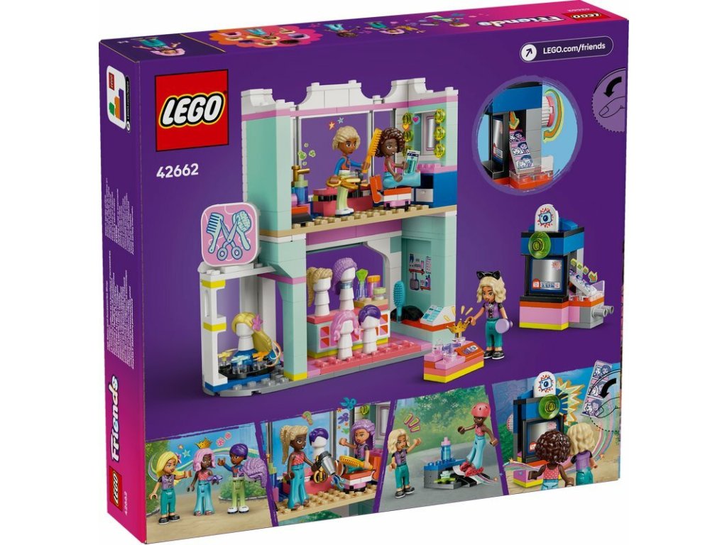 Děti od 7 let budou milovat zábavu při hraní rolí se sadou LEGO® Friends Kadeřnictví a obchod s domácími dekoracemi (42662). Hračka obsahuje tři minifigurky LEGO Friends a spoustu vlasových doplňků pro kreativní hru. Tato sada vám umožní vytvářet příběhy o kamarádkách Nově a Aliyi, které tráví den zkoušením nových účesů s kadeřníkem Farajim. Dvoupatrová budova má v patře kadeřnictví se stylingovými křesly, fény, kartáči a parukami, které si postavy mohou vyzkoušet. V přízemí je obchod s doplňky s dalšími parukami a skvělými doplňky, které doplní nový vzhled hrdinek. Děti mohou umístit postavičky do fotobudky a udělat ze zařízení fotky Aliya a Novy. Sada obsahuje také otočný displej, dále rampu pro kolečkové brusle a helmu. Prohlédněte si další zábavné sady LEGO Friends (prodávají se samostatně), kde najdete ještě více příběhů o přátelství.