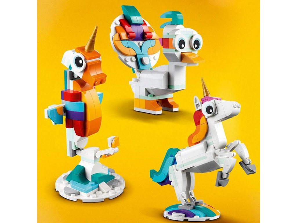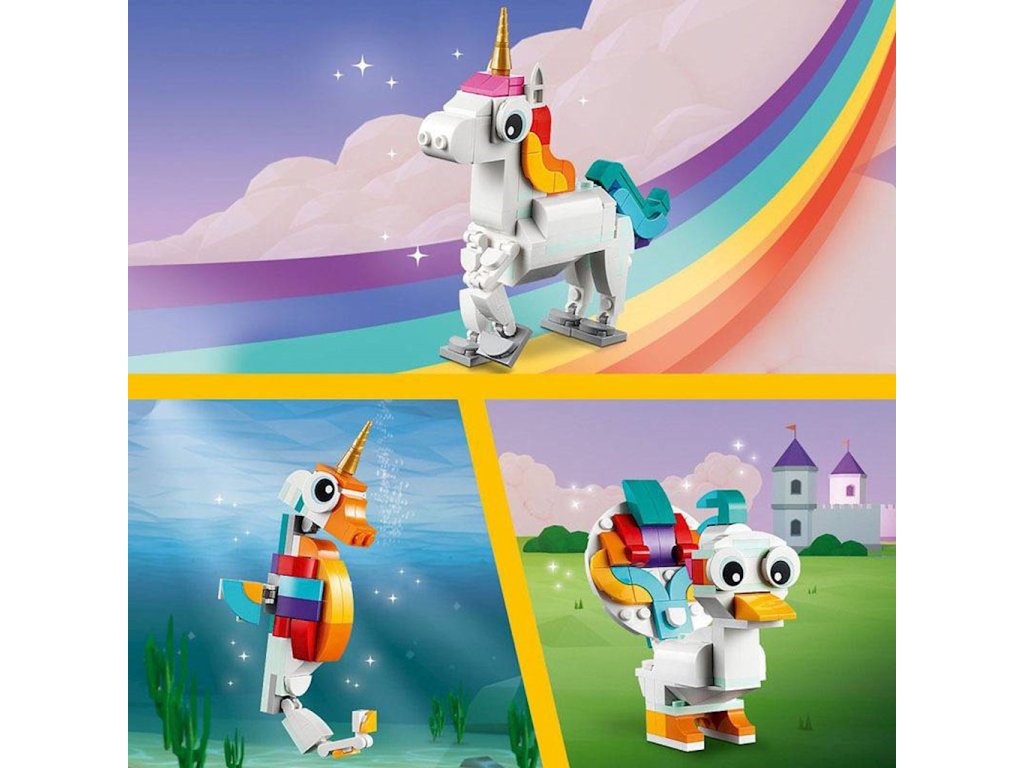 Se třemi různými kouzelnými tvory, které si malí stavitelé mohou sestavit v rámci zábavy z této sady LEGO Creator 3 v 1, bájná dobrodružství nikdy nekončí. Děti si mohou postavit pohyblivého kouzelného jednorožce, přeměnit ho na mořského koníka na podstavci, který napodobuje mořské dno, nebo z něj udělat pohyblivého kouzelného páva s barevným ocasem, nebo dokonce z kostek vytvořit úplně jiné roztomilé stvoření.