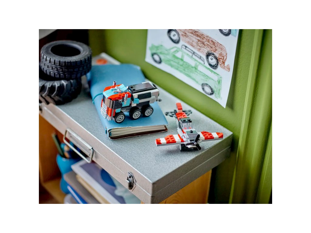 Lego Creator Flatbed Truck and Helicopter 31146Během hry se sadou LEGO® Creator valník a helikoptéra (31146). Sedmileté a starší děti zažijí spoustu vzrušení. S 270 prvky mohou postavit cool nákladní auto s pohyblivými koly a přívěsem pro LEGO vrtulník, který má navíc pohyblivý rotor. Sada 3 v 1 LEGO Creator umožňuje dětem postavit tři různé sady s vozidly. Může to být valník a vrtulník, vrtulník s tankerem na pohyblivých kolech nebo hot rod s SUV pro závodění. Děti nic nezastaví vynalezli a postavili vlastní vozidla. Hračky LEGO Creator 3 v 1 jsou skvělé dárky pro děti obsahující tři různé modely v jedné krabici. Mohou být postaveny a přestavěny na vůle, což zaručuje nespočet hodin zábavy. Různé modely Díky tomu jsou sady vhodné pro každý vkus: superrychlí nadšenci vozidla, úžasná zvířata nebo detailní městská dioráma.