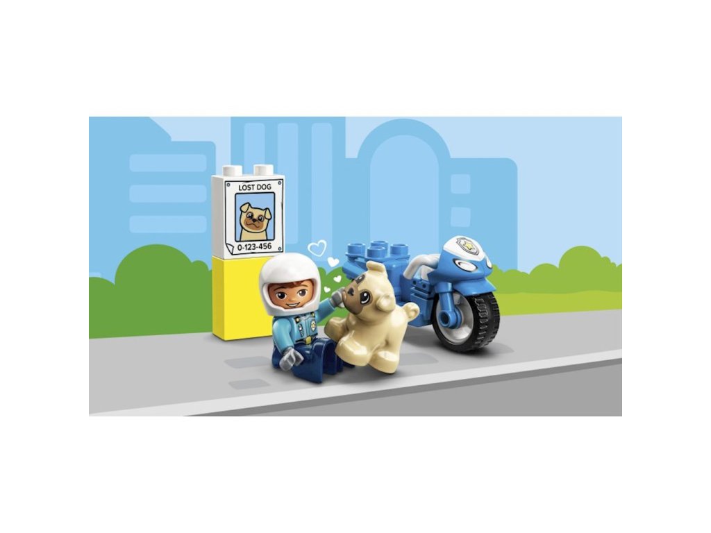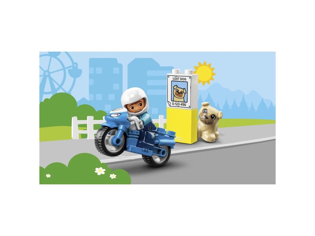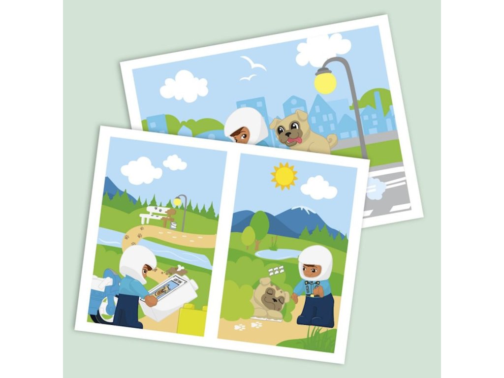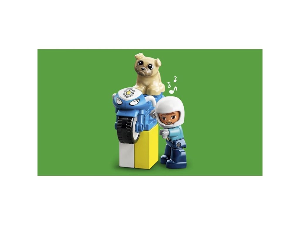 Policejní motorku si mohou děti sestavit z 5 dílků.Poté si mohou s figurkou policisty přehrát příběh, kdy budou hledt zmizelého pejska.