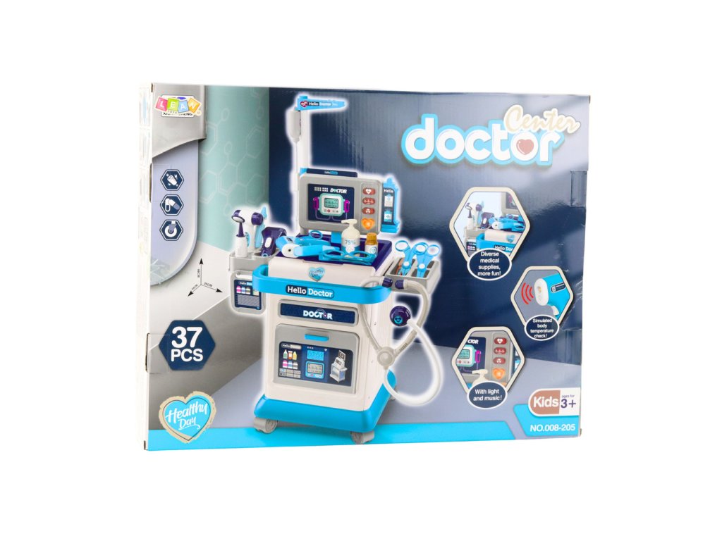 Zdravotnický vozík je mobilní a stabilní a rozsáhlá sada (37 dílků!) poskytuje dětem mnoho hodin kreativní hry. Mezi příslušenstvím je stetoskop, teploměr, injekční stříkačka, otoskop, lahvičky, rentgenové karty a také police a zásuvky pro uložení vybavení.