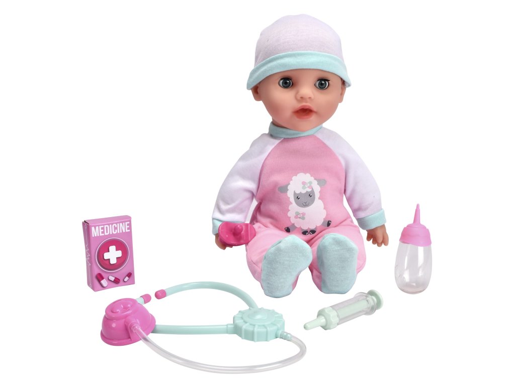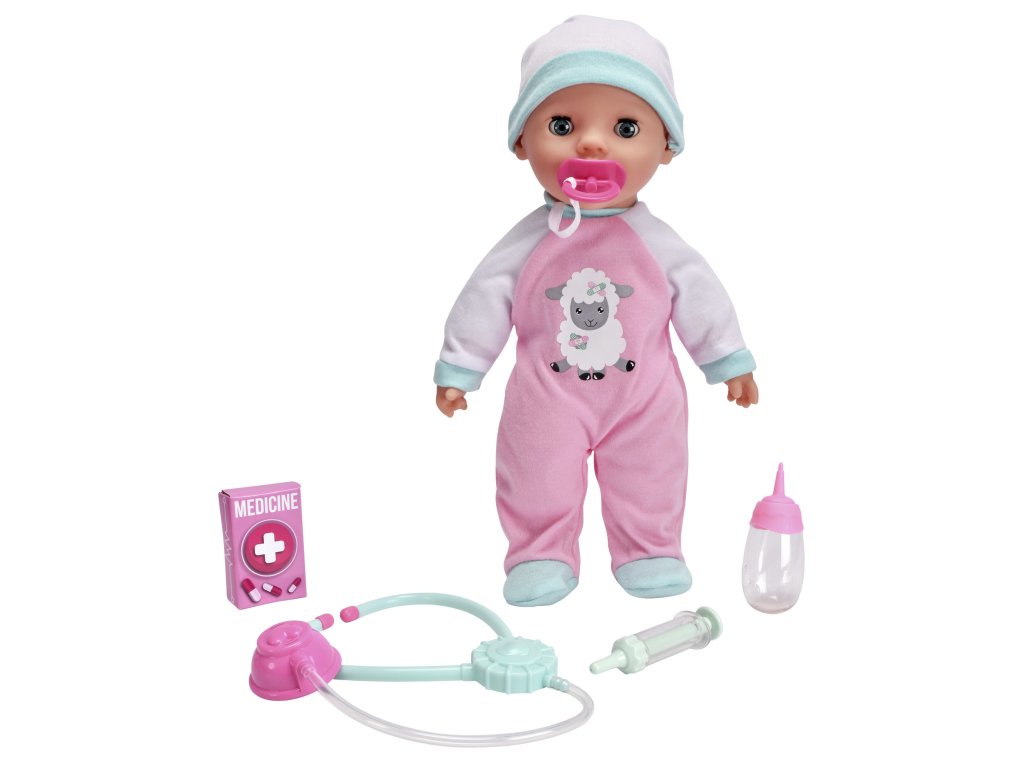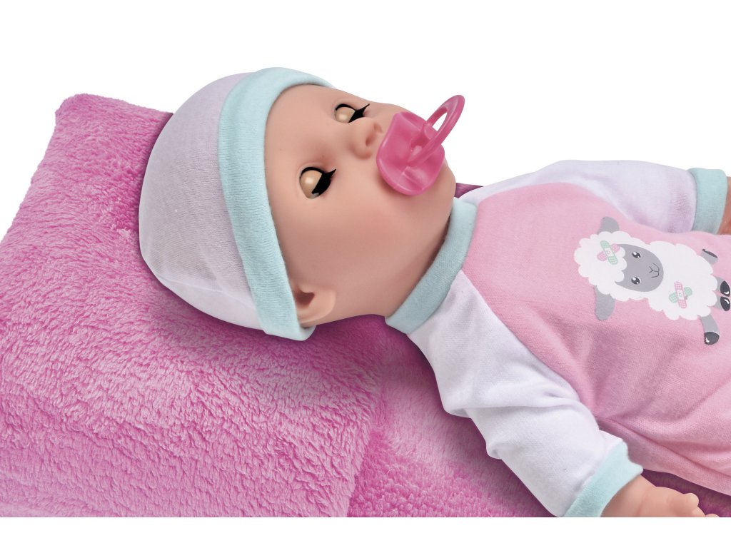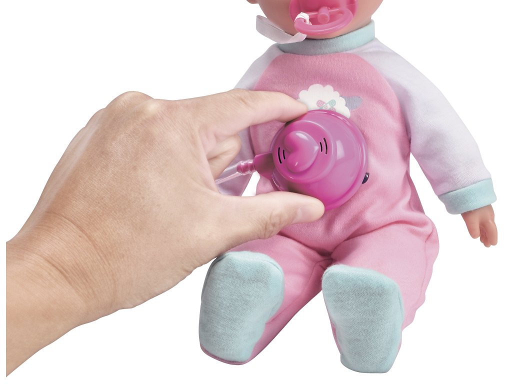 Panenka v setu je oblečená v růžovo-bílém overalu s dlouhými rukávy a nohama, zdobenými barevným vzorem a světle růžovými volánky. Panenka nosí na hlavě odpovídající klobouček a v ústech růžový dudlík . Panenka má gumovou hlavu, ruce a nohy a plastové tělo , takže ji můžete ponořit do vody . Když navíc stisknete její bříško, panenka vydá až 24 zvuků, včetně: pláče, smíchu a škytání. Panenka je dodávána s fantastickým doplňky , které pomohou každému malému poskytnout vynikající péči: