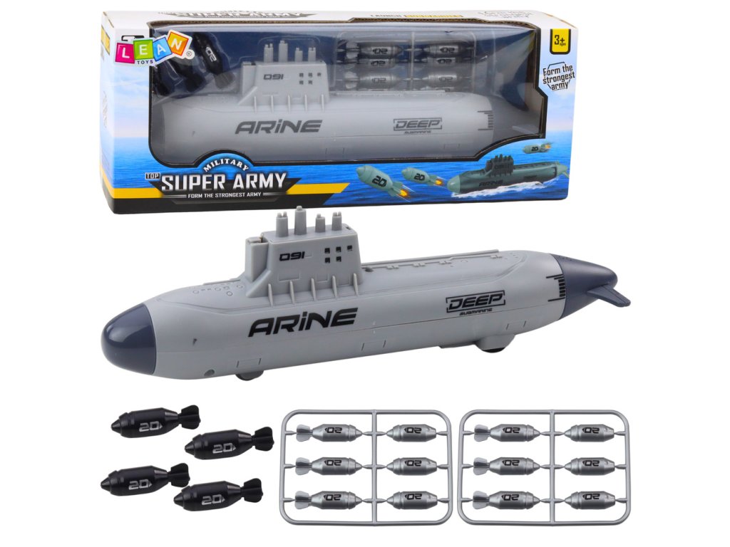 Realistická 28 cm dlouhá ponorka je skvělá hračka pro mladé fanoušky vojenských a námořních dobrodružství. Díky třecímu pohonu (mechanickému napětí) se člun může pohybovat po hladině a funkce torpédového odpalu dodává vzrušení a činí každou hru atraktivnější.