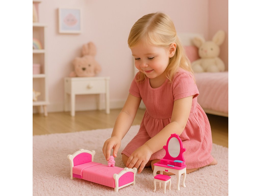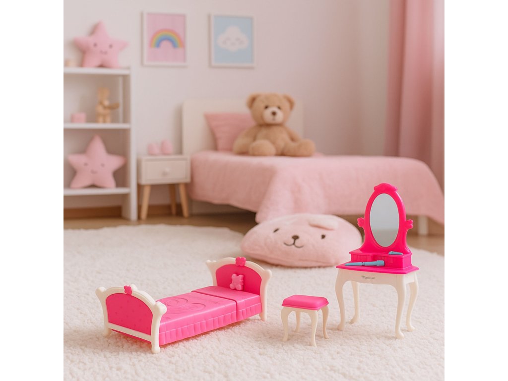 Ložnice pro panenky – toaletní stolek, židle, postel
