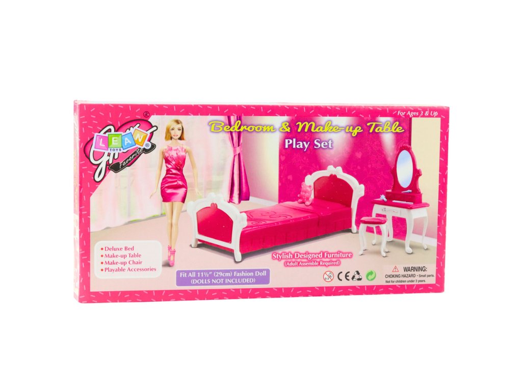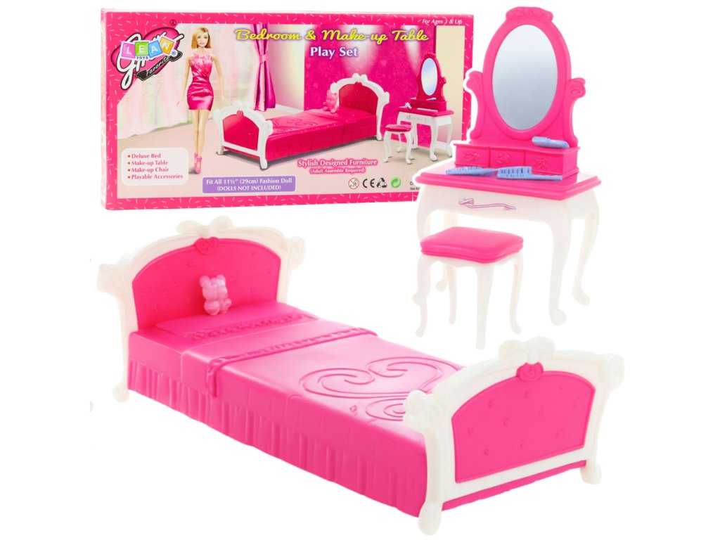 Sada ložnice s toaletním stolkem je elegantní sada nábytku určená pro módní panenky vysoké přibližně 29 cm. Tato sada vám umožní vytvořit plně zařízený pokoj, kde si vaše panenka může odpočinout, připravit se a účastnit se každodenních činností souvisejících s péčí o srst. Sada obsahuje stylovou postel, moderní toaletní stolek se zrcadlem a k ní laděnou židli, čímž vytváří funkční a atraktivní interiér.