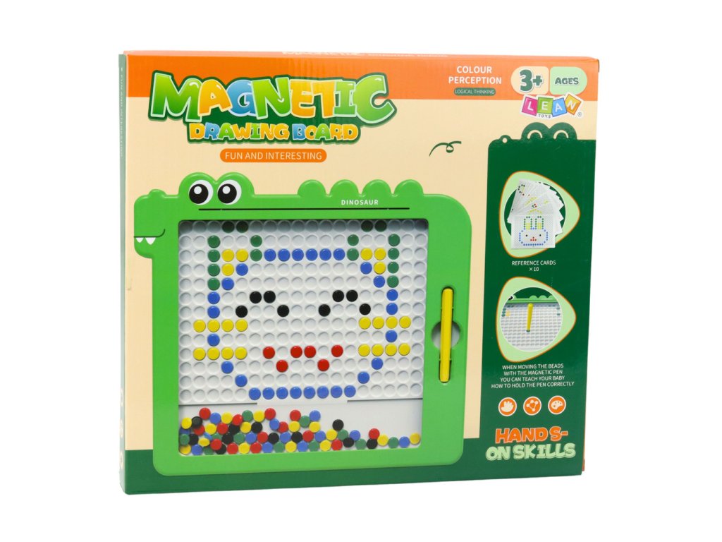 Magnetická tabule Dinosaur je jedinečná vzdělávací hračka, která kombinuje učení s kreativní hrou. Díky inovativnímu systému barevných disků a magnetickému stylusu může dítě vytvářet nejrůznější obrázky bez použití papíru, pastelek nebo barev. Stačí pohybovat stylusem s magnetem po povrchu desky a přitahovat a uspořádat barevné body na vybraných místech. Všechna kouzla se odehrávají uvnitř bezpečné konstrukce - magnety nejsou k dispozici venku, díky čemuž je hračka zcela bezpečná.