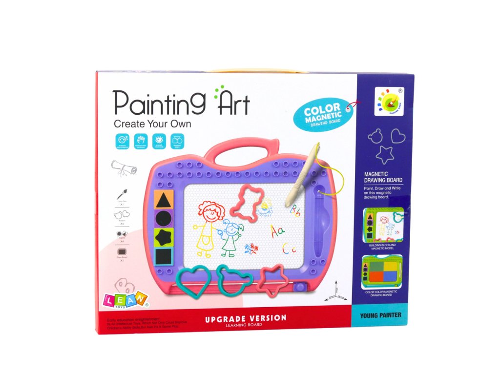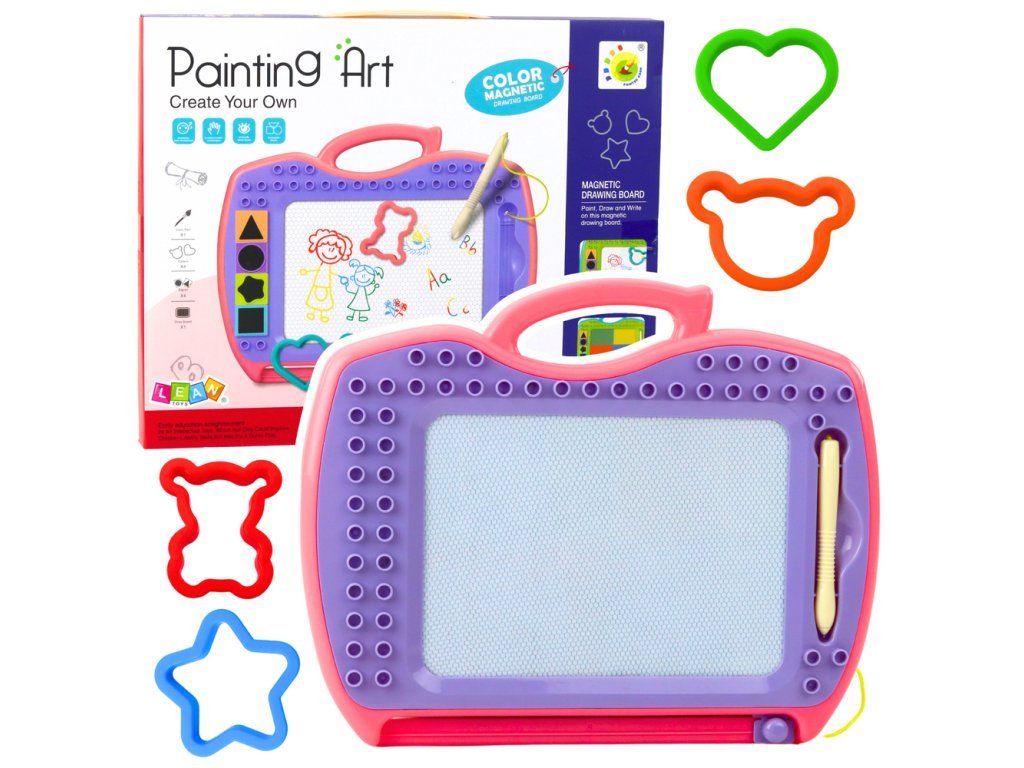 Sada obsahuje čtyři různá razítka a čtyři vzory ke kreslení, které podporují rozvoj kreativního myšlení a usnadňují první krůčky při kreslení. Barevné magnetické pole přitahuje pozornost dítěte a díky kompaktním rozměrům a praktické rukojeti si desku můžete vzít kamkoli s sebou - na procházku, do auta nebo na výlet.