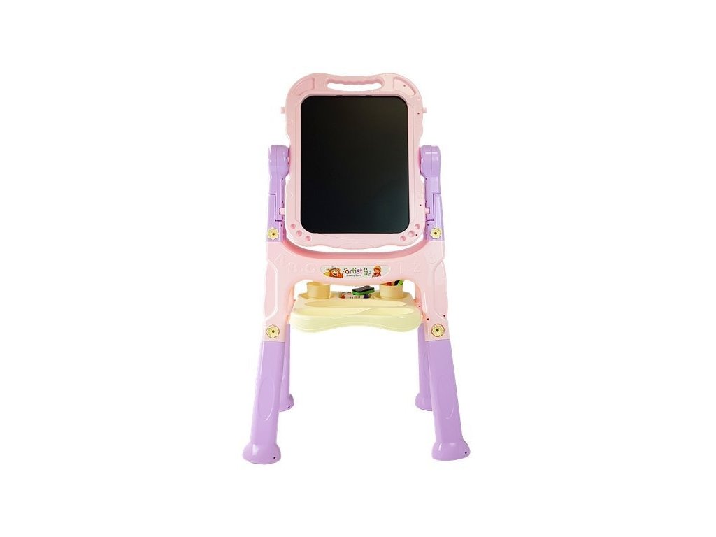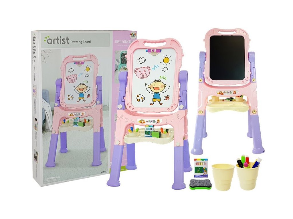 Tabule má dvě kreslící strany - bílou, určenou pro stírací pera, a černou, na kterou lze kreslit křídou. Dá se otočit o 360 stupňů. Sada obsahuje fixy v černé, modré, červené, zelené a sadu 12 křídově žlutých. Vzhledem k tomu, že tabule je magnetická, sada obsahuje barevnou magnézii, kterou můžete připevnit na tabuli s vašimi kresbami. Celá sada obsahuje 48 prvků.