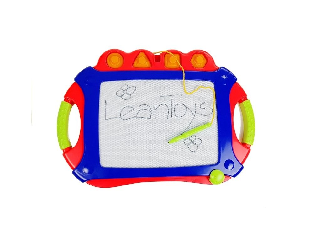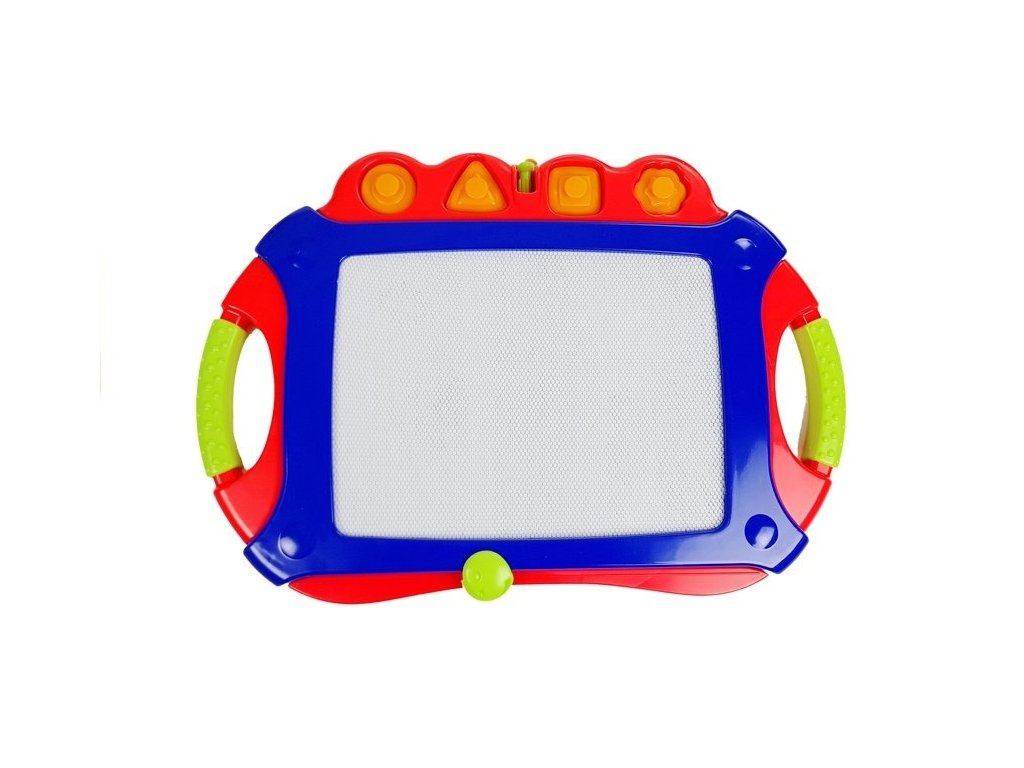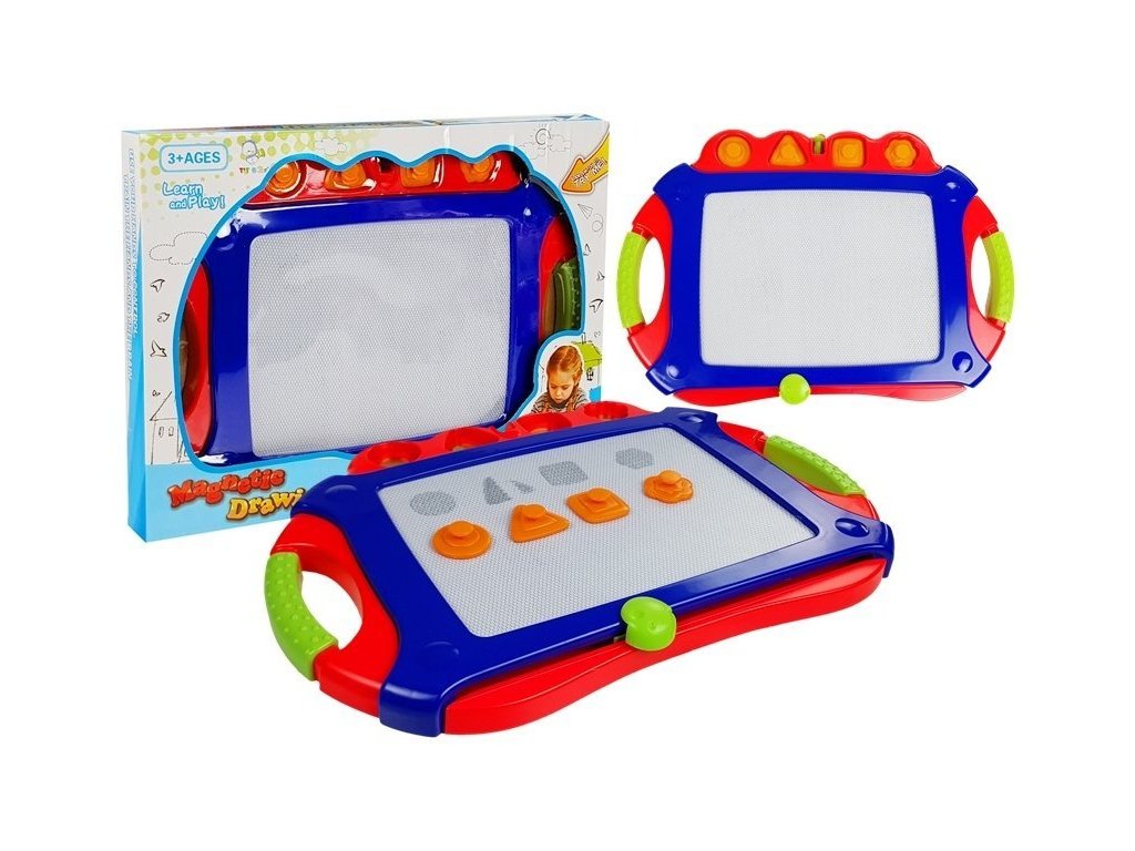 Prezentovaná sada se skládá z působivé desky, stylusu a čtyř razítek ve tvaru geometrických obrazců. Velká magnetická tabule se skládá z neutrálních příjemných barev - klasické barvy osloví dívky i chlapce. Po stranách jsou madla, která usnadňují přenášení hračky.